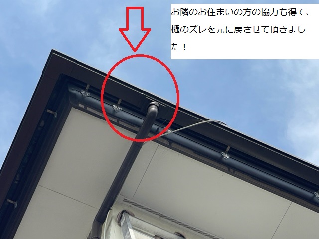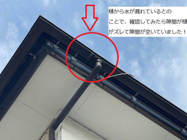 事前に屋根の樋から水が漏れてるとご相談を頂き、現地にて近隣の方のご協力も得て、