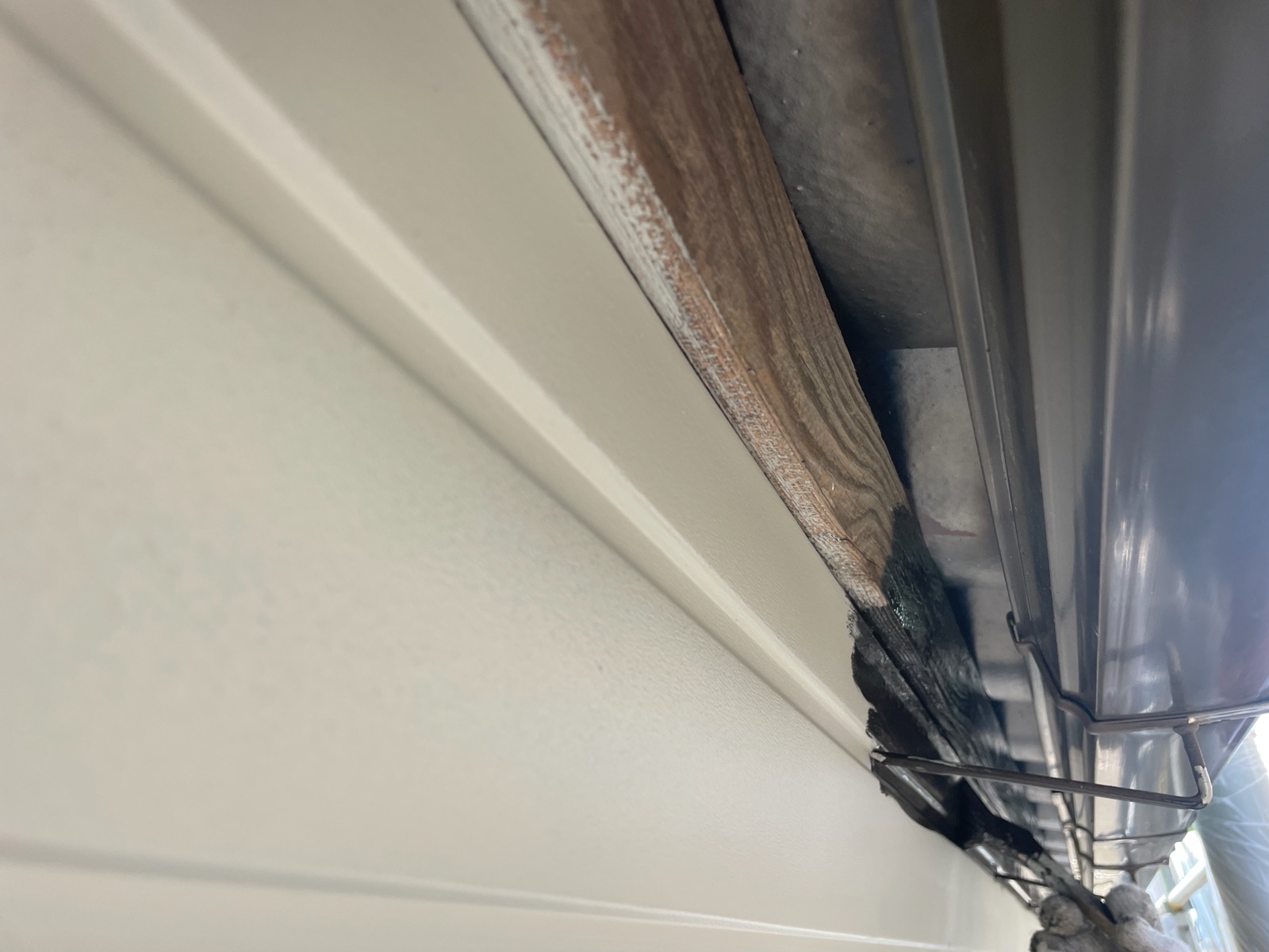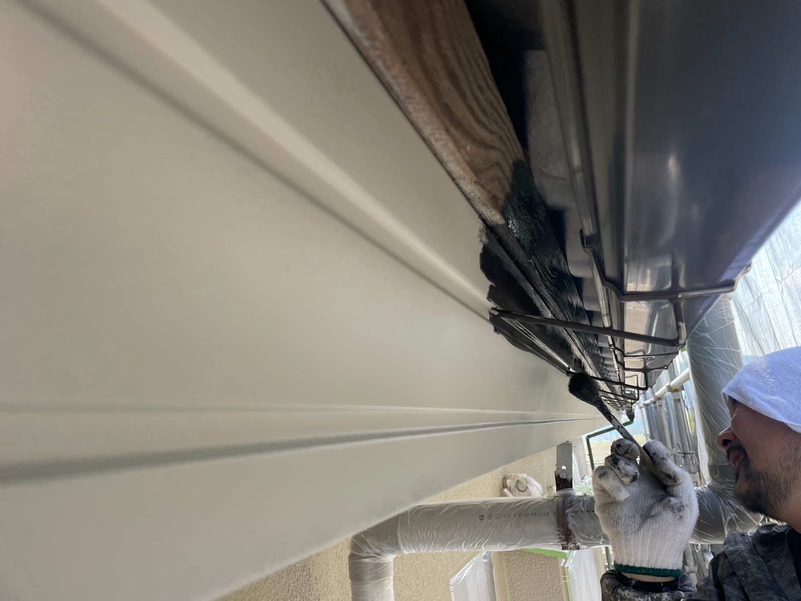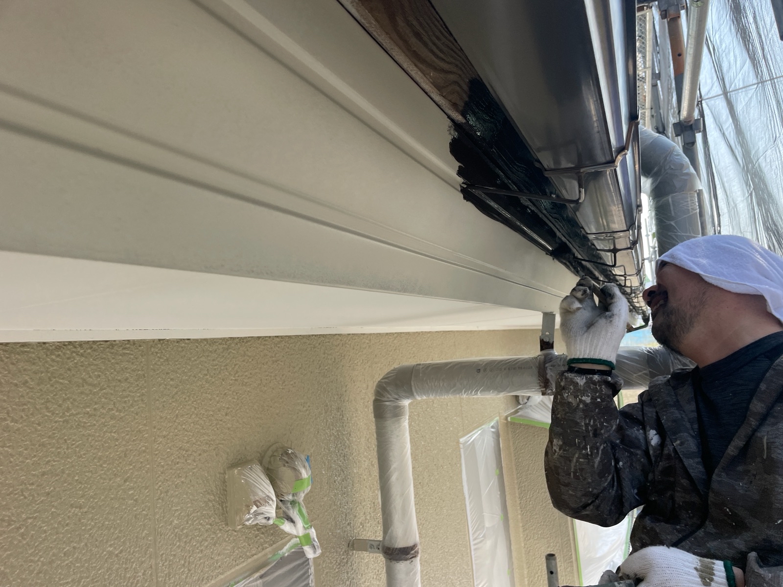 外壁の上塗り1回目を終えて、付帯部の塗装をさせて頂いております!
