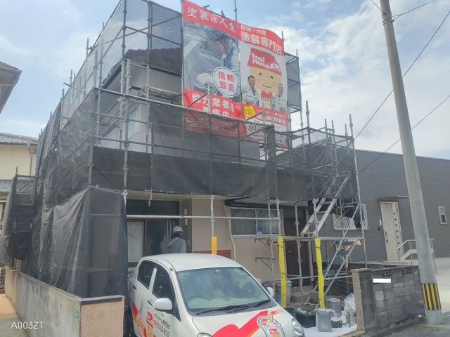 本日は、2階周り外壁下塗り2回目、2階周り外壁中間検査、軒天塗装、1階周り養生をさせて頂いております。