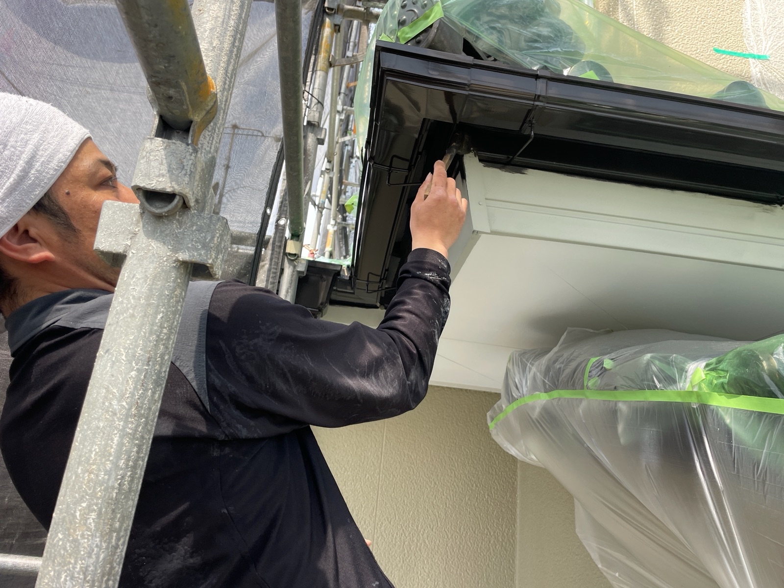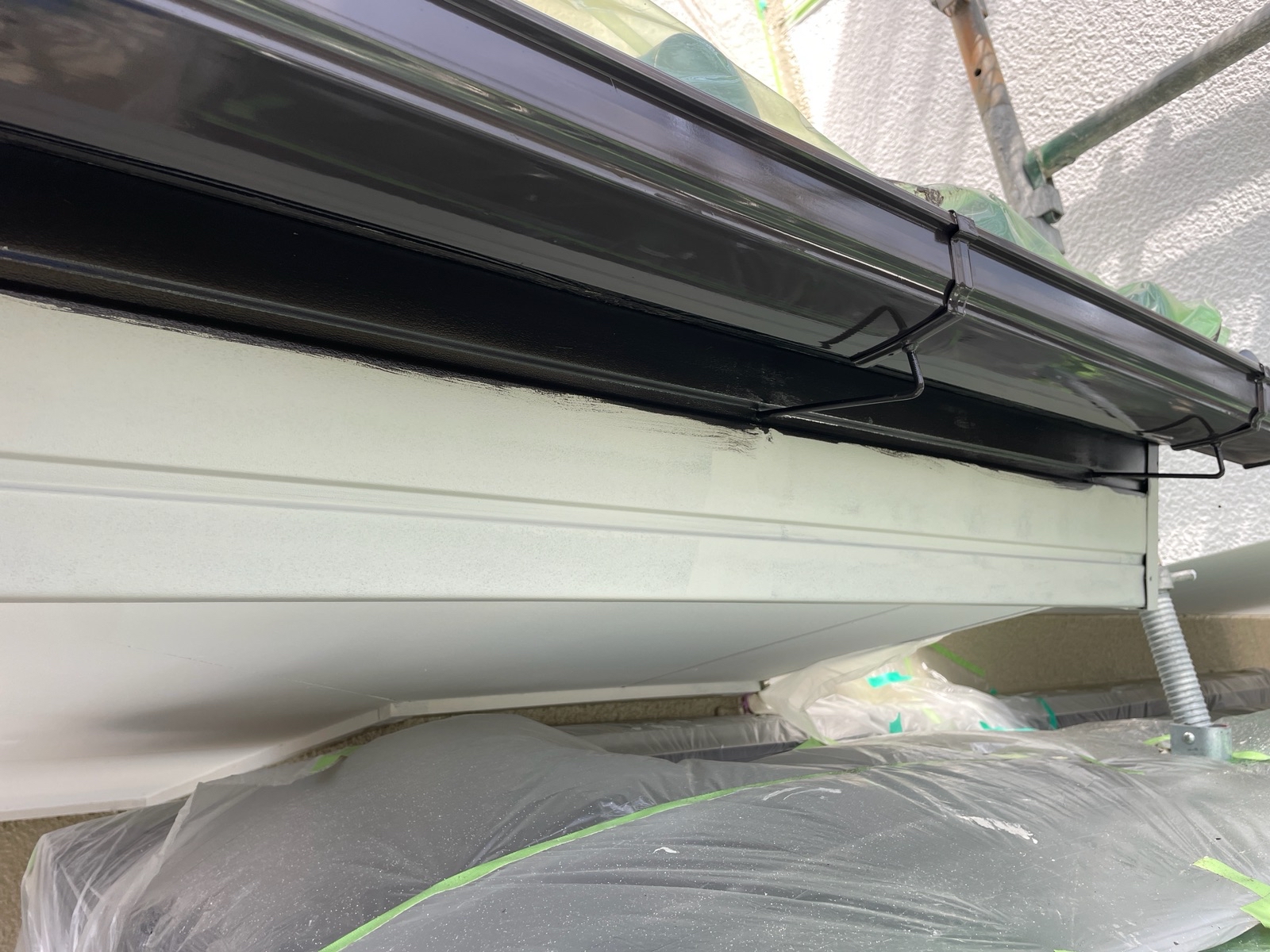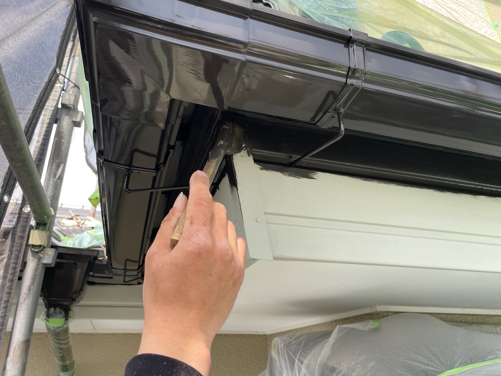 外壁の上塗り2回目を終えて、付帯部の塗装をさせて頂いております!