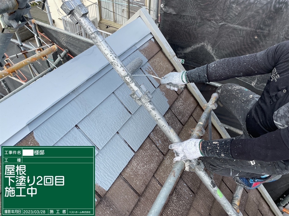 本日は、外壁下塗り2回目、屋根下塗り2回目の施工をさせて頂いております。