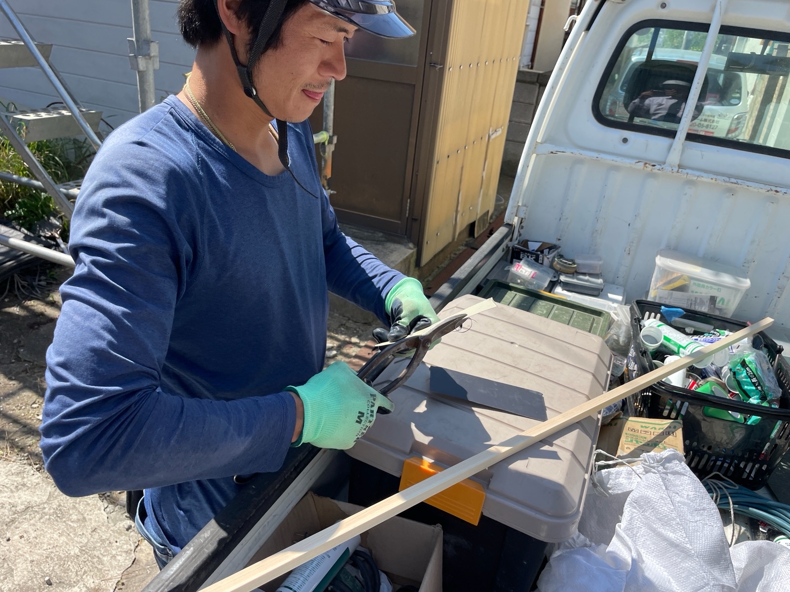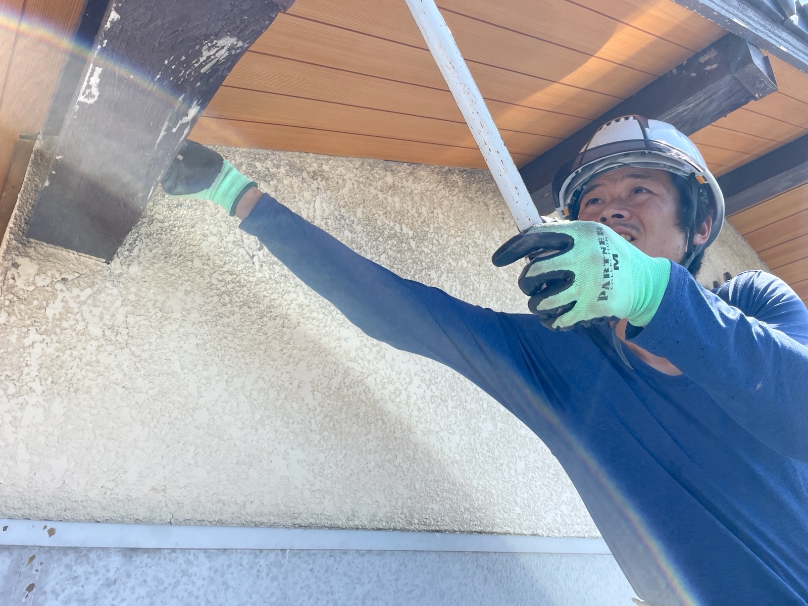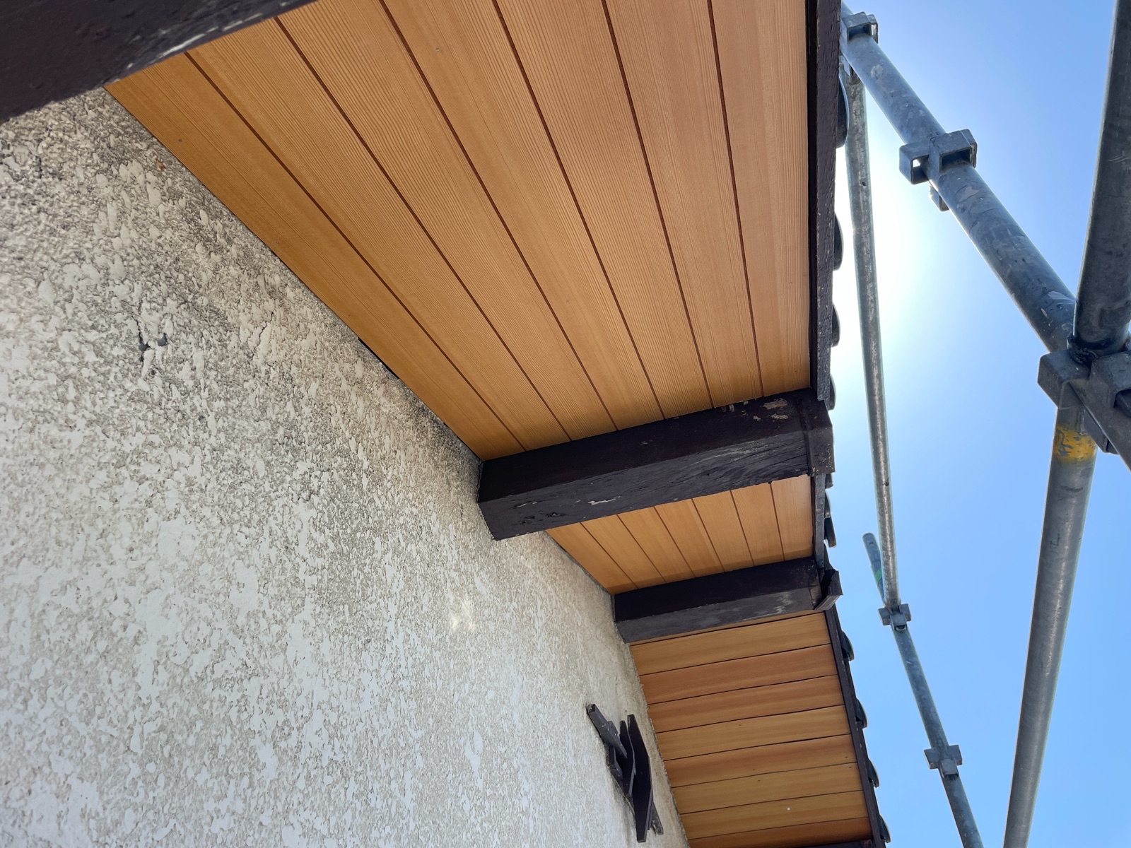 本日は、軒天の上張り、破風板張り、テラス撤去部補修などをさせて頂いております。