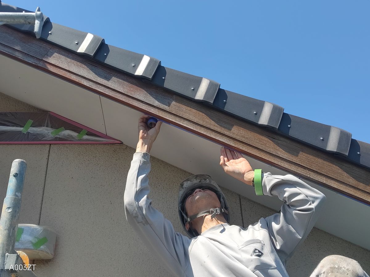 本日は、養生作業、鉄部錆止め、軒天塗装1回目などをさせて頂いております。