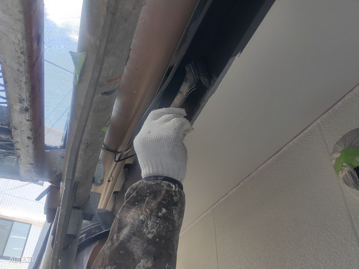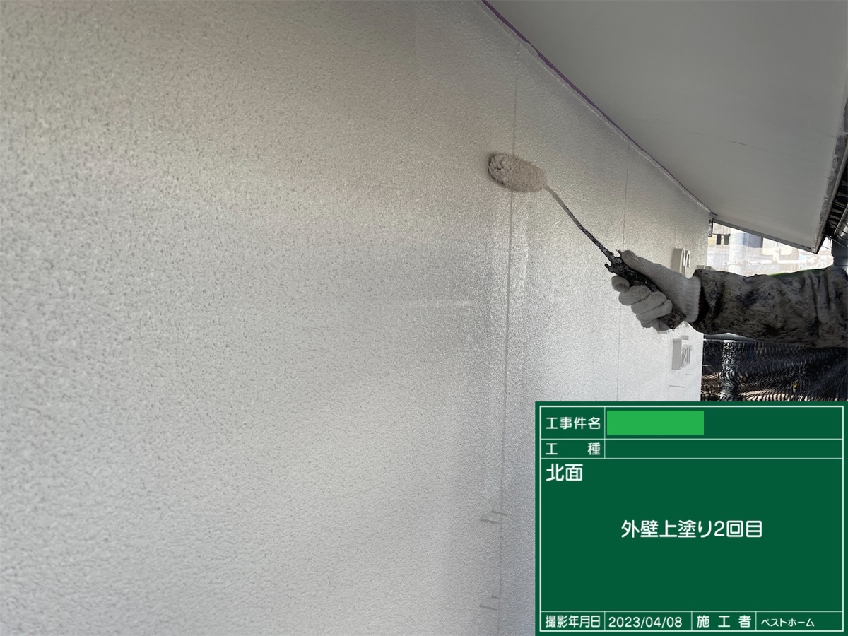本日は、外壁上塗り2回目(クールホワイト)、付帯塗装をさせて頂いております。