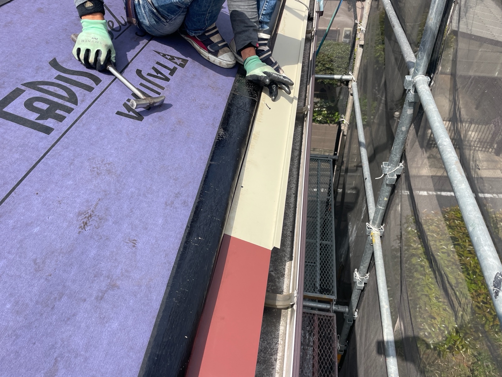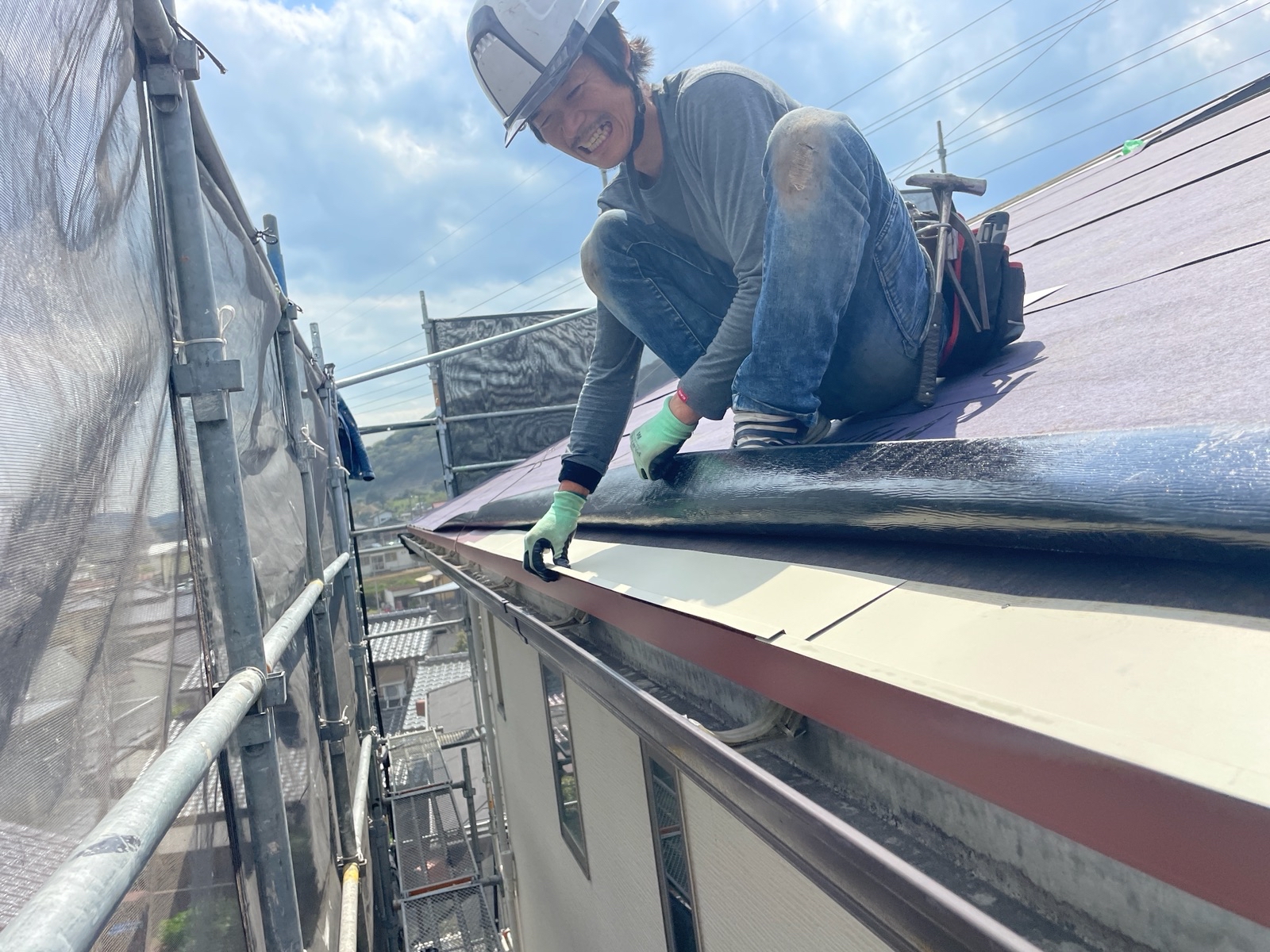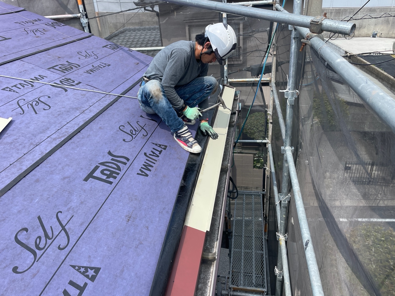 ルーフィングシートの上から本日はガルバリウム板金を貼っております!