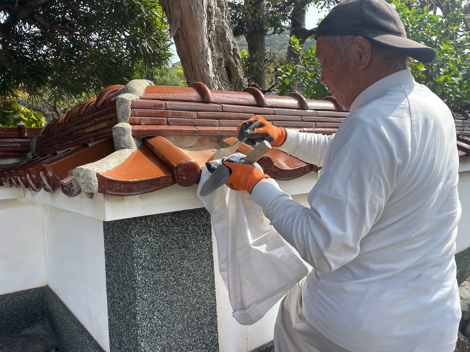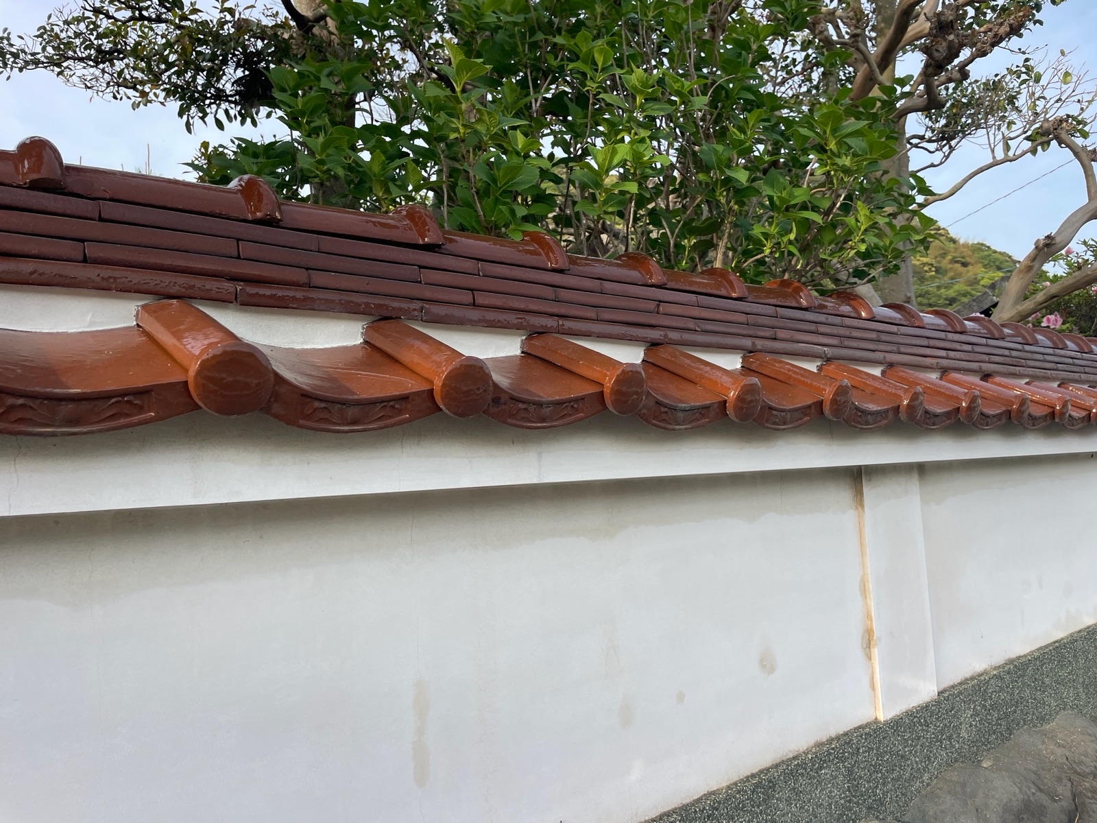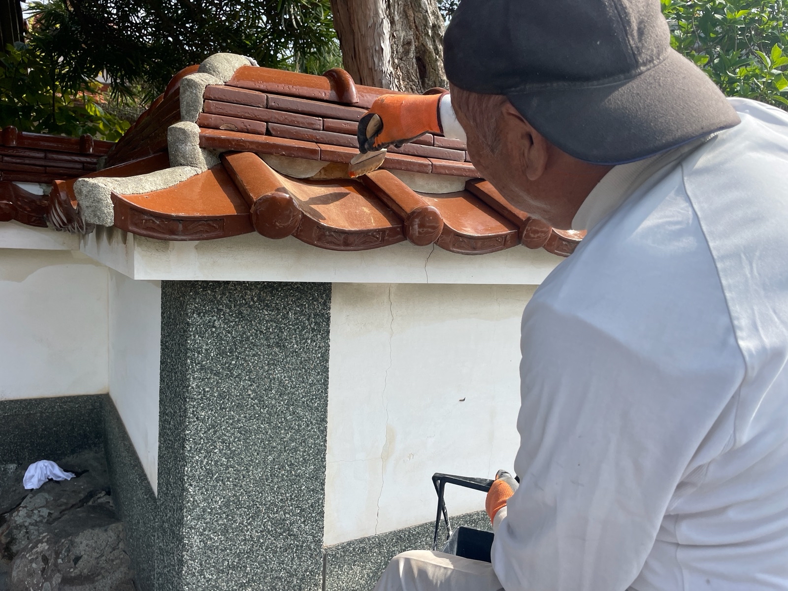 本日も塀の瓦部分の漆喰上塗り工事を行っております!