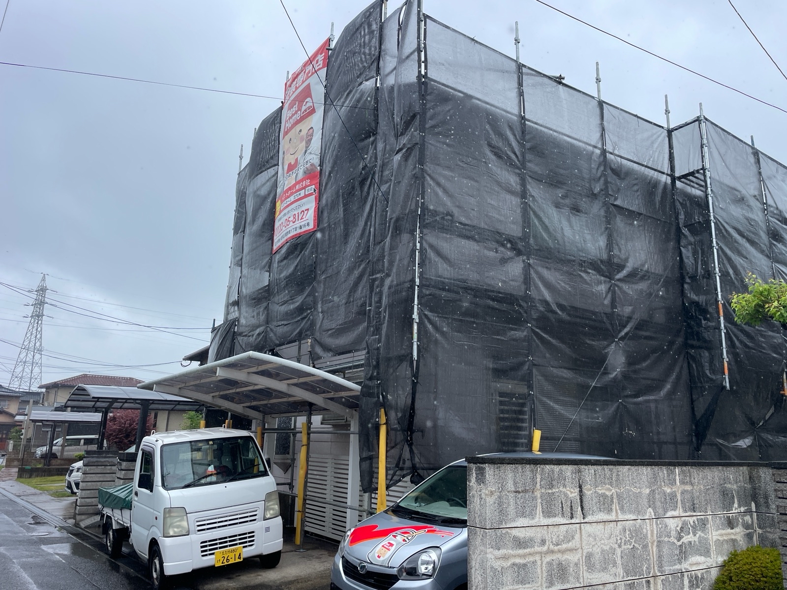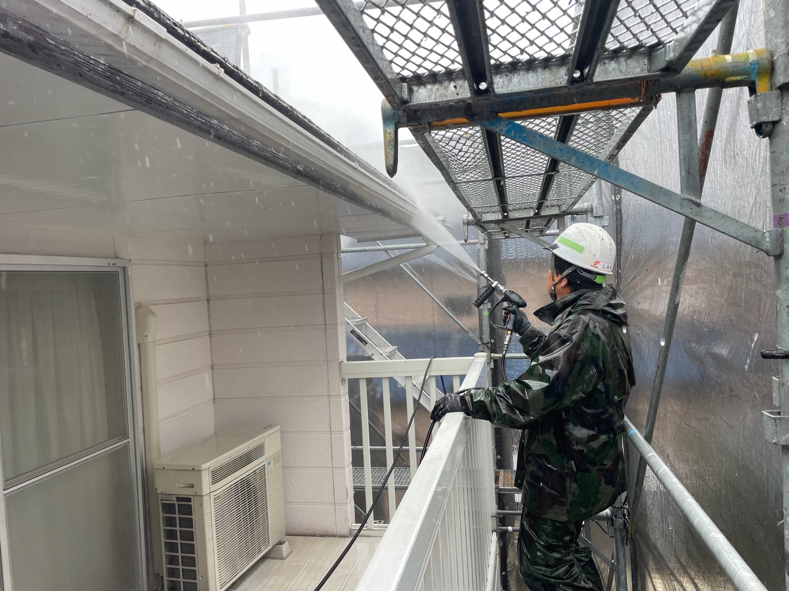 高圧洗浄にて、しっかりと旧塗膜や汚れを落とさないと、