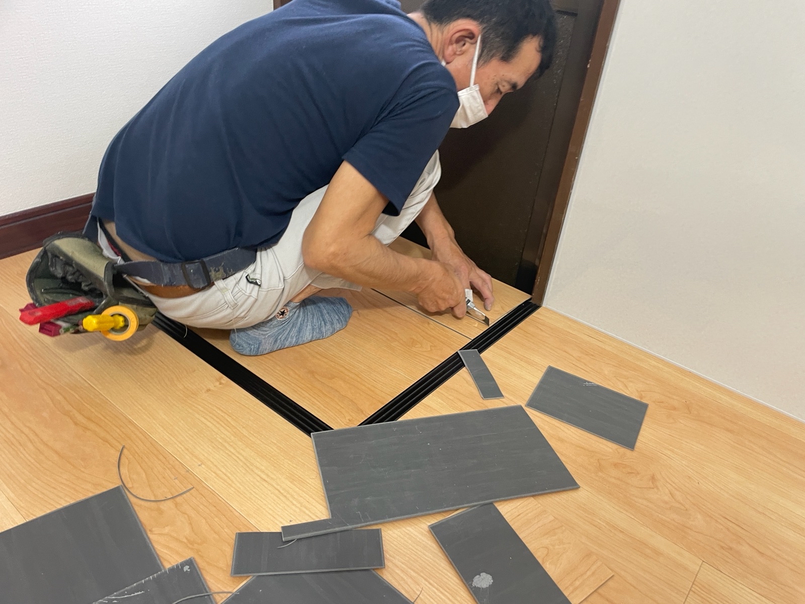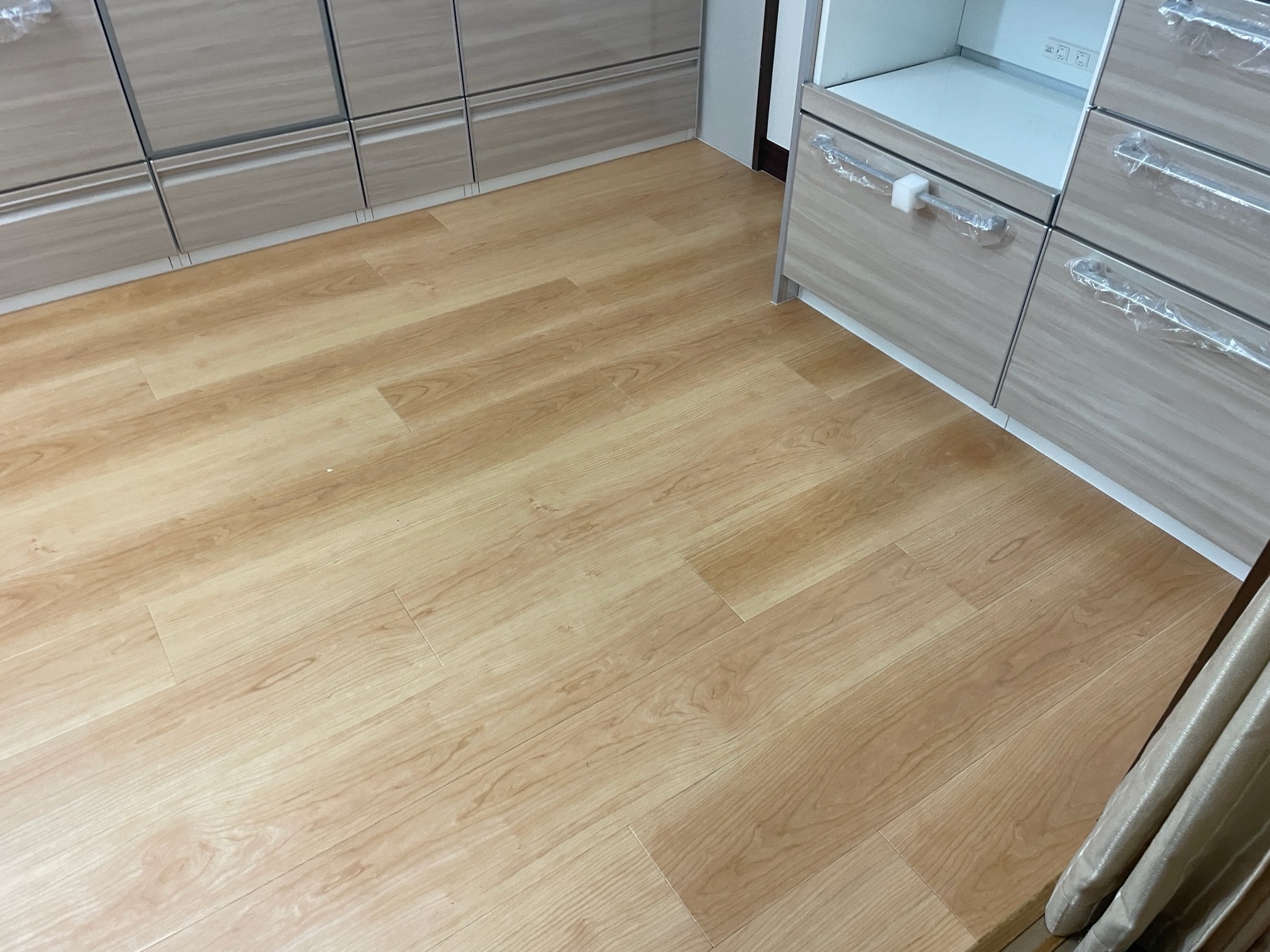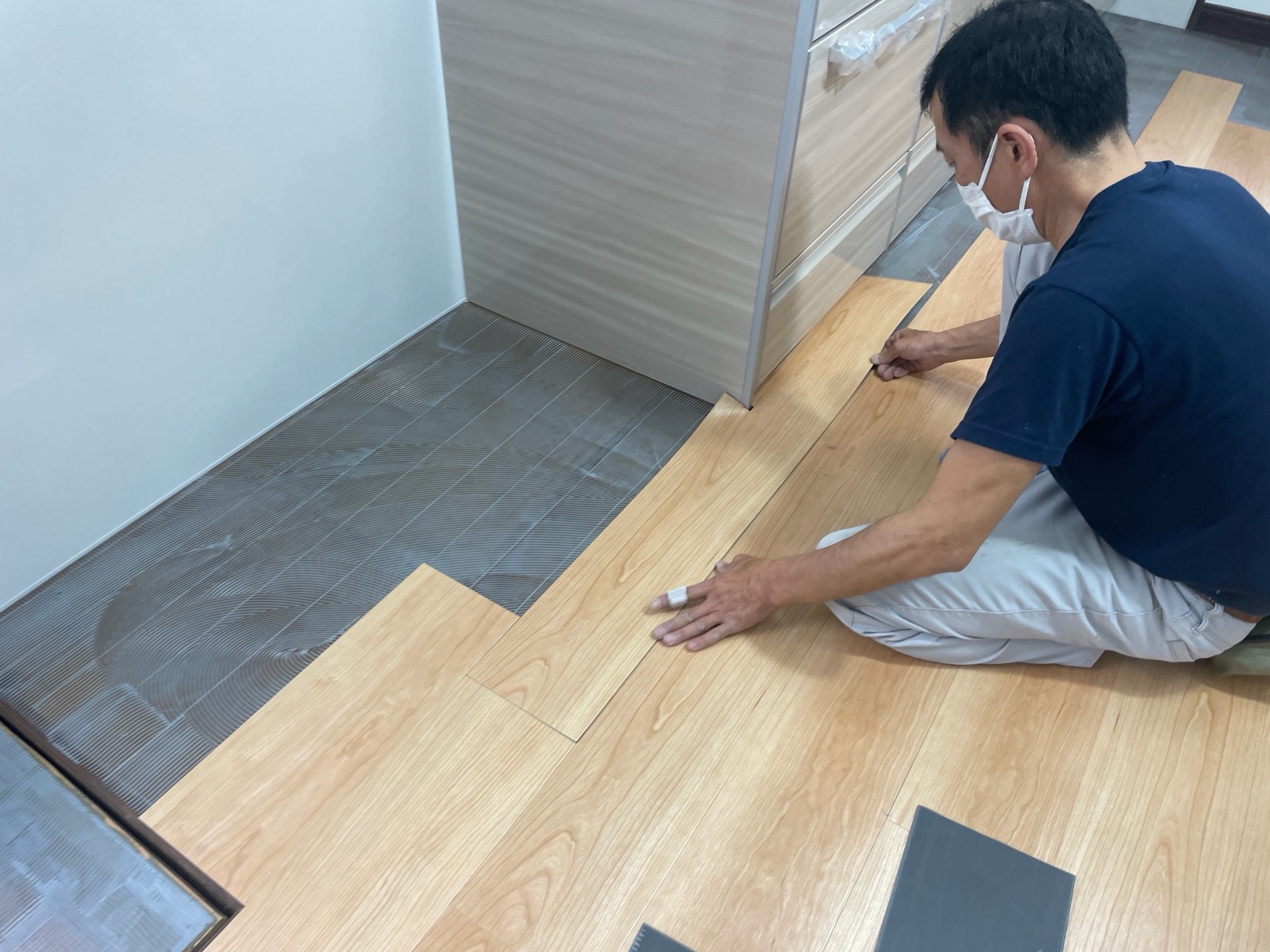 本日はキッチン床の塩ビタイルを貼らせて頂いております!