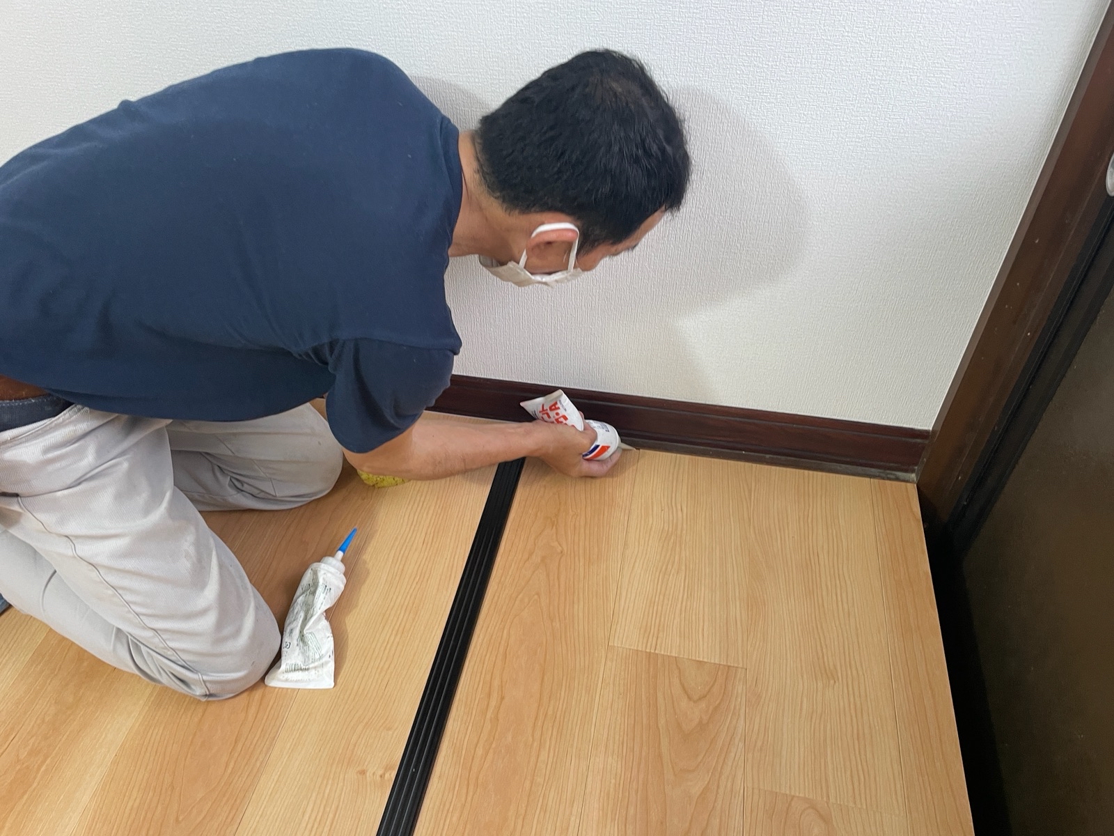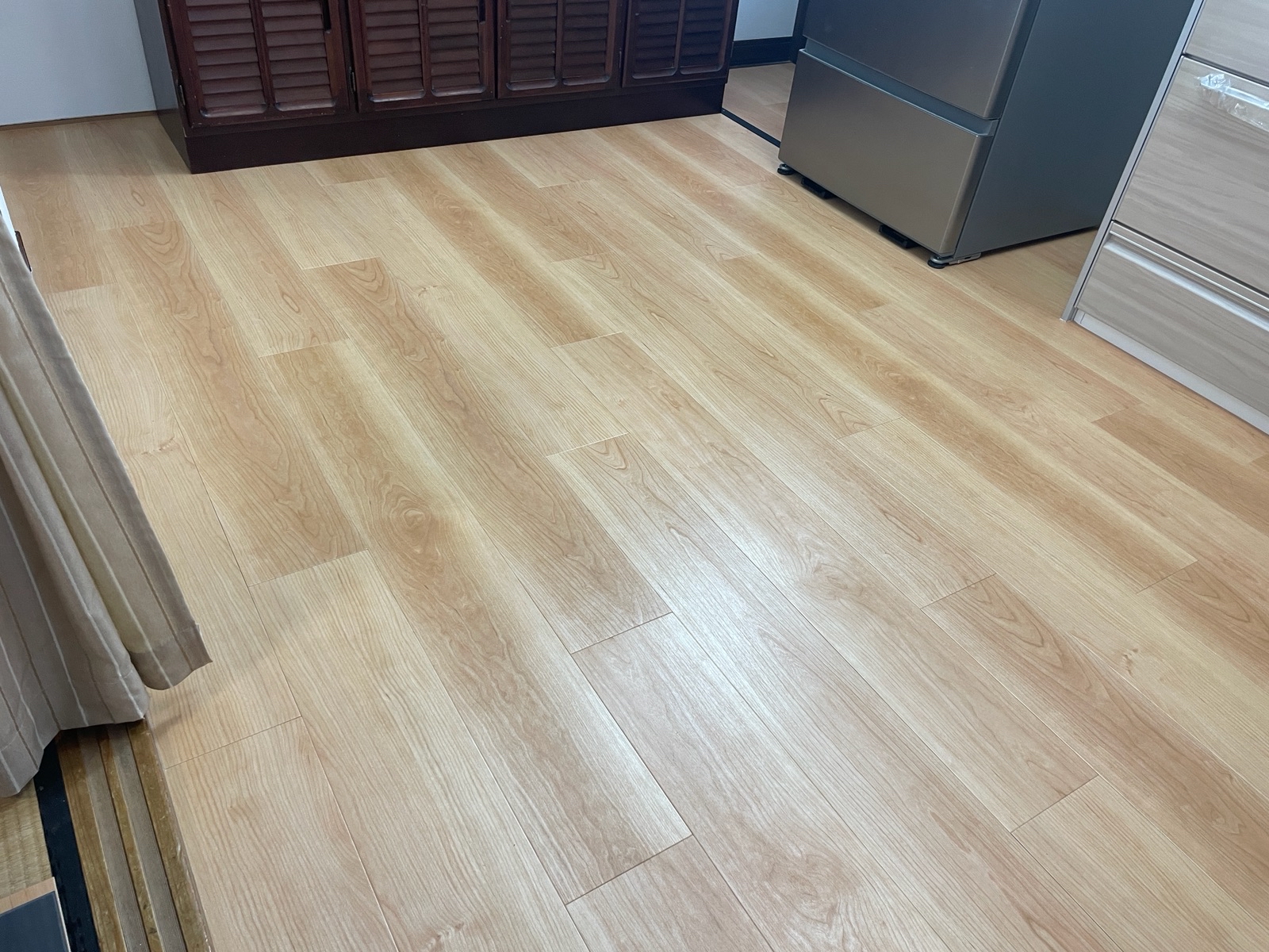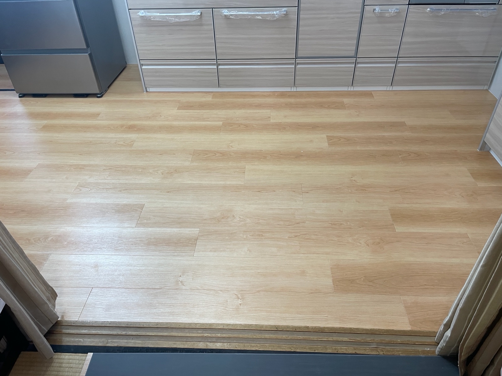 本日はキッチン床の塩ビタイルを貼らせて頂いております!