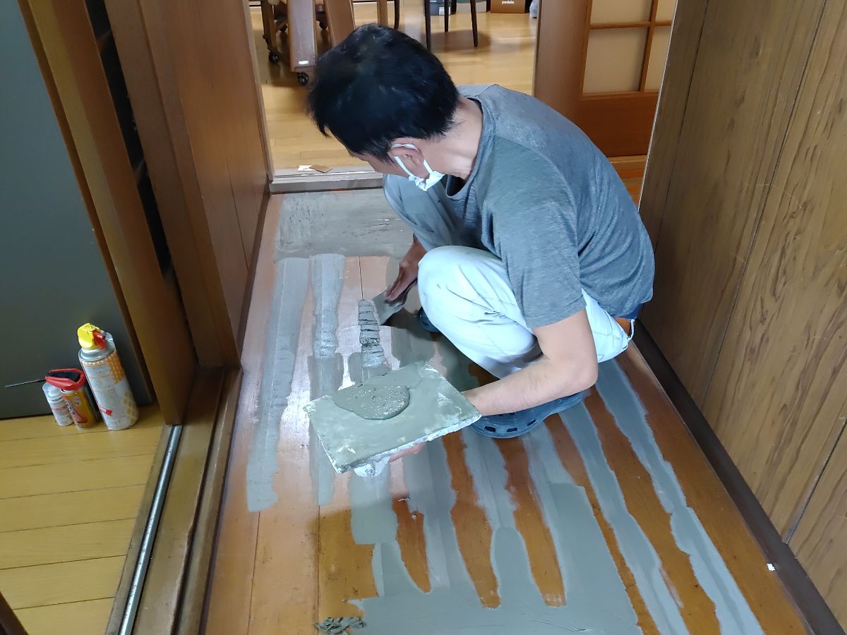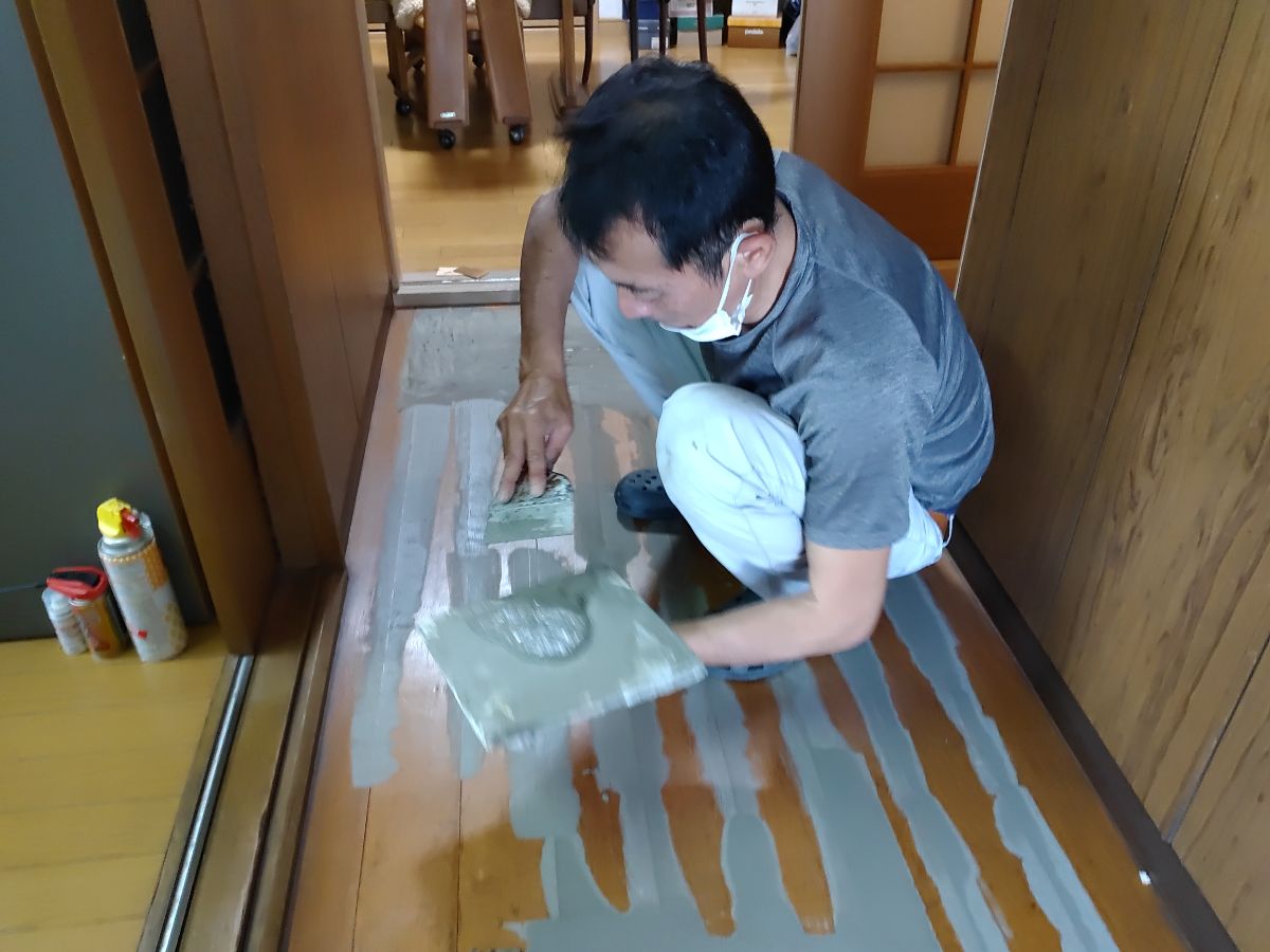 しっかりと接着剤を塗布し、乾いてから床材を張ってまいります!