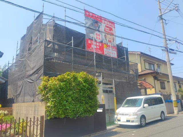 本日は、外壁(1階)上塗り1回目、外壁(2階)上塗り2回目をさせて頂いております。