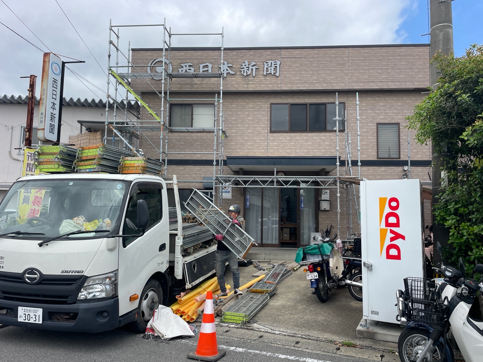 本日は、仮設足場の組立てをさせて頂いております。