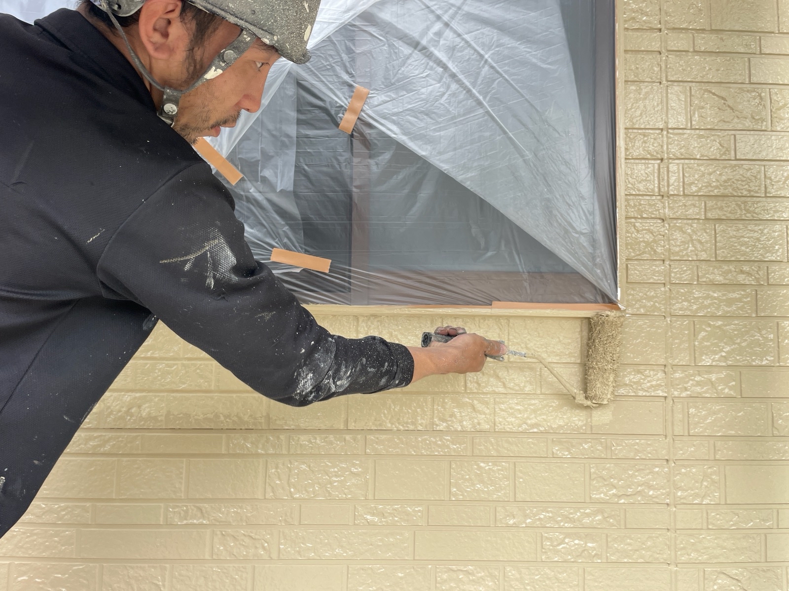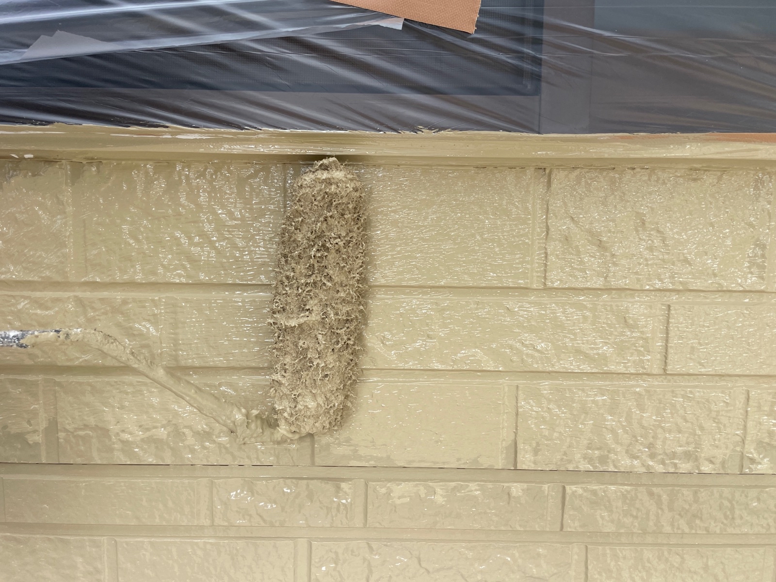 下塗りを行った外壁に上塗りをまずは1回たっぷりと塗布させて頂いております!
