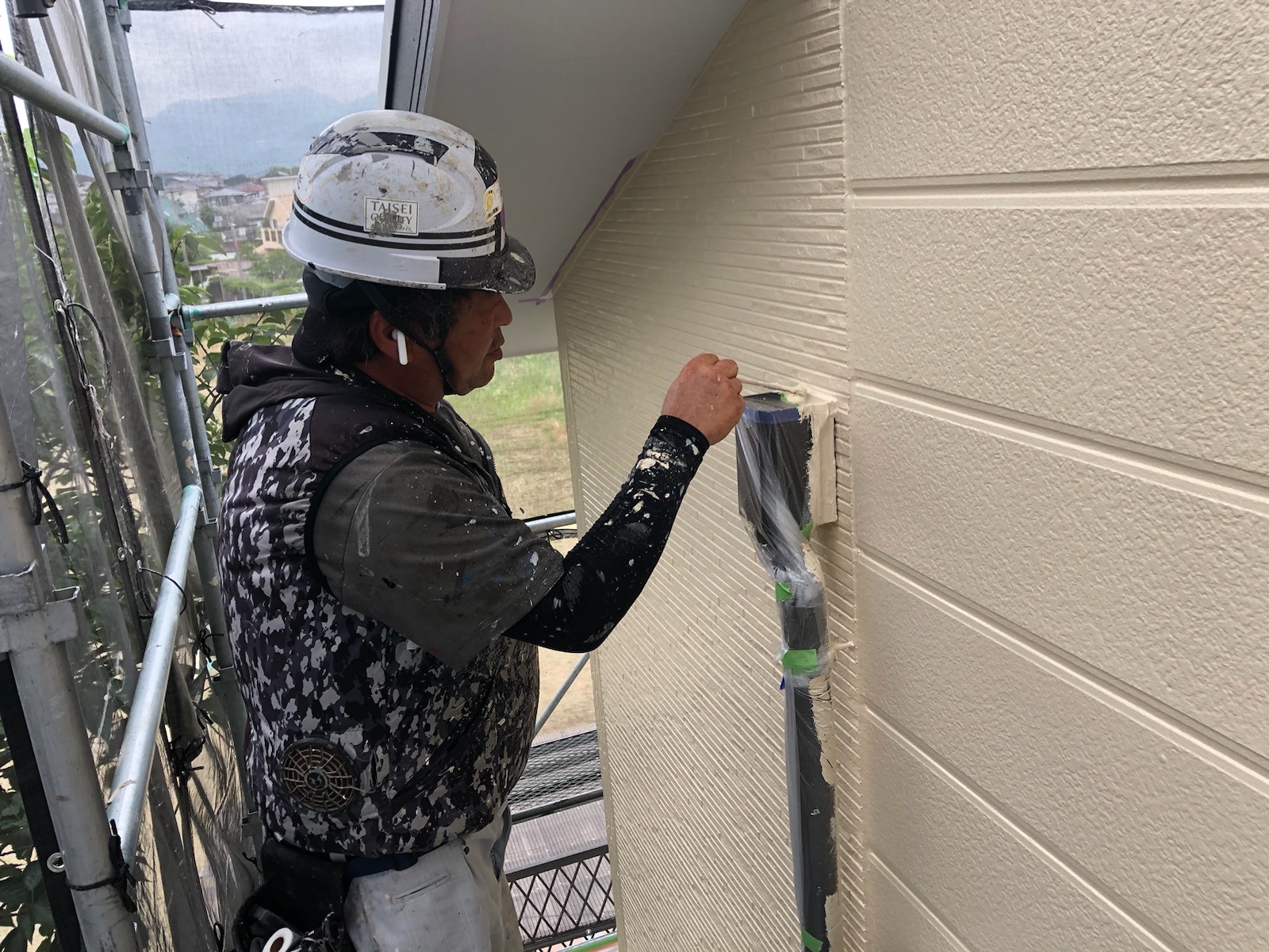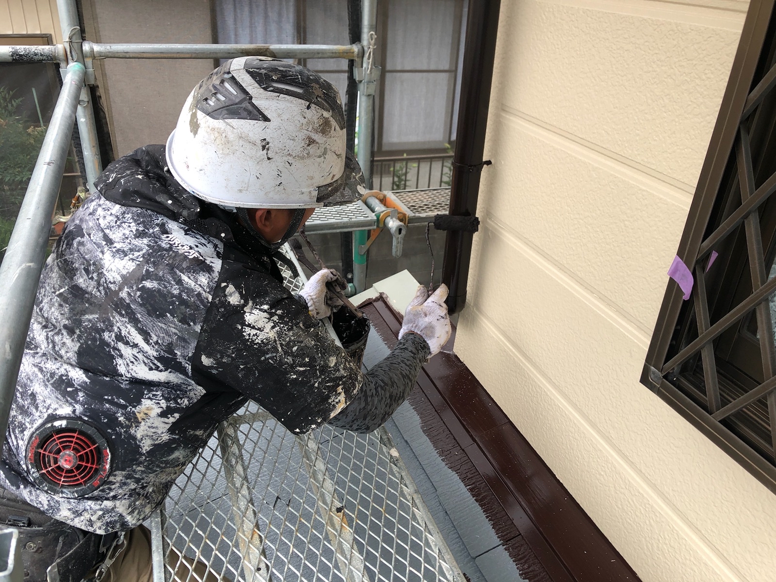 本日は、外壁上塗り2回目と付帯部塗装をさせて頂いております。