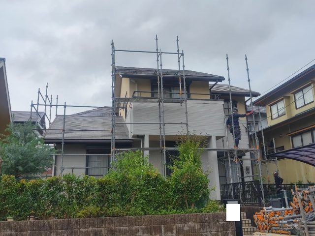 午後から雨が落ち着いたので無事に足場組立が行えました!