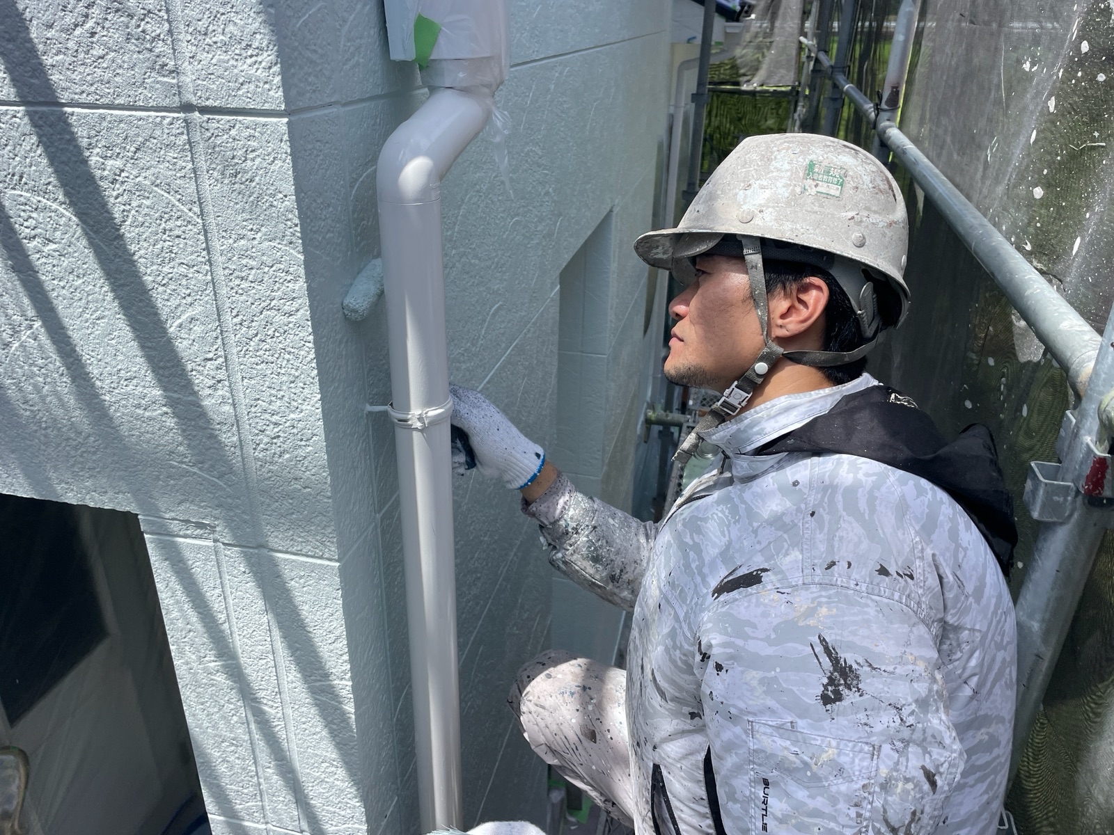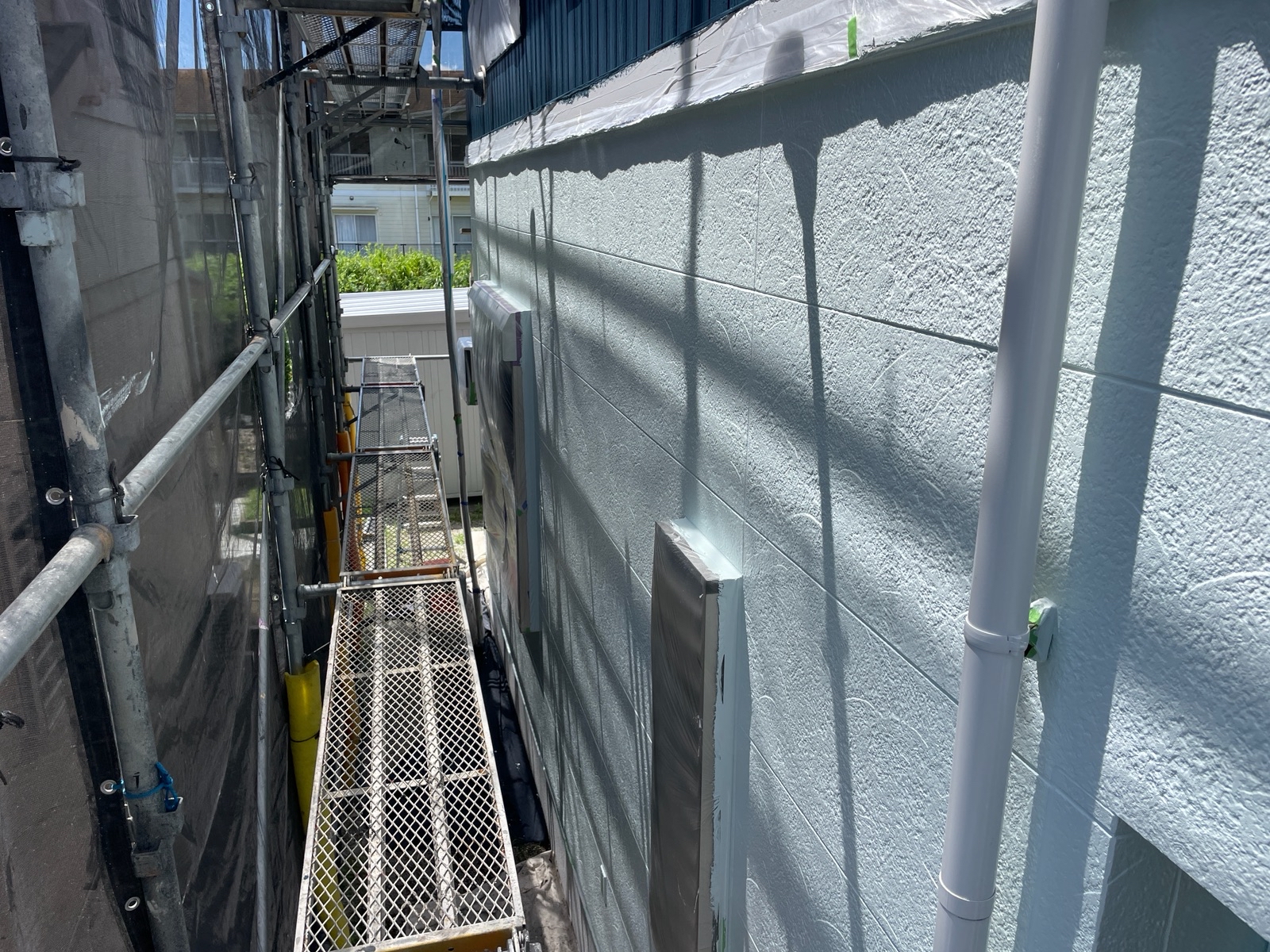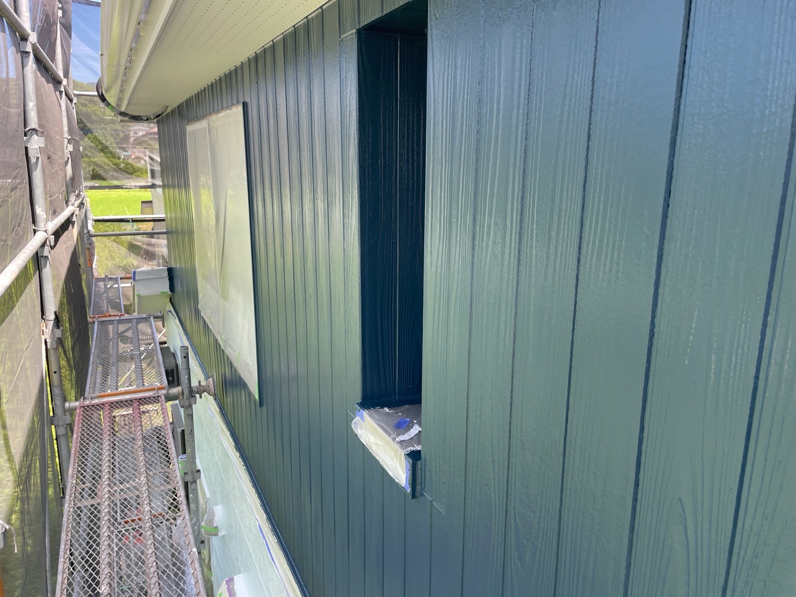 本日は、外壁上塗り2回目と下屋根の上塗り2回目の施工をさせて頂いております。