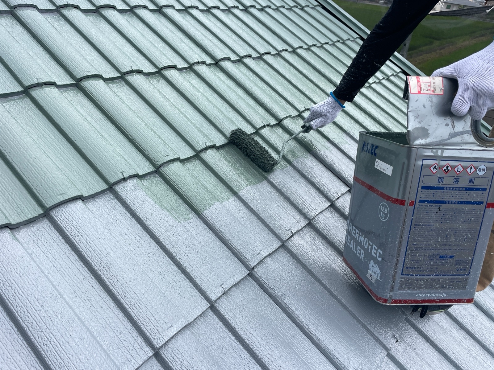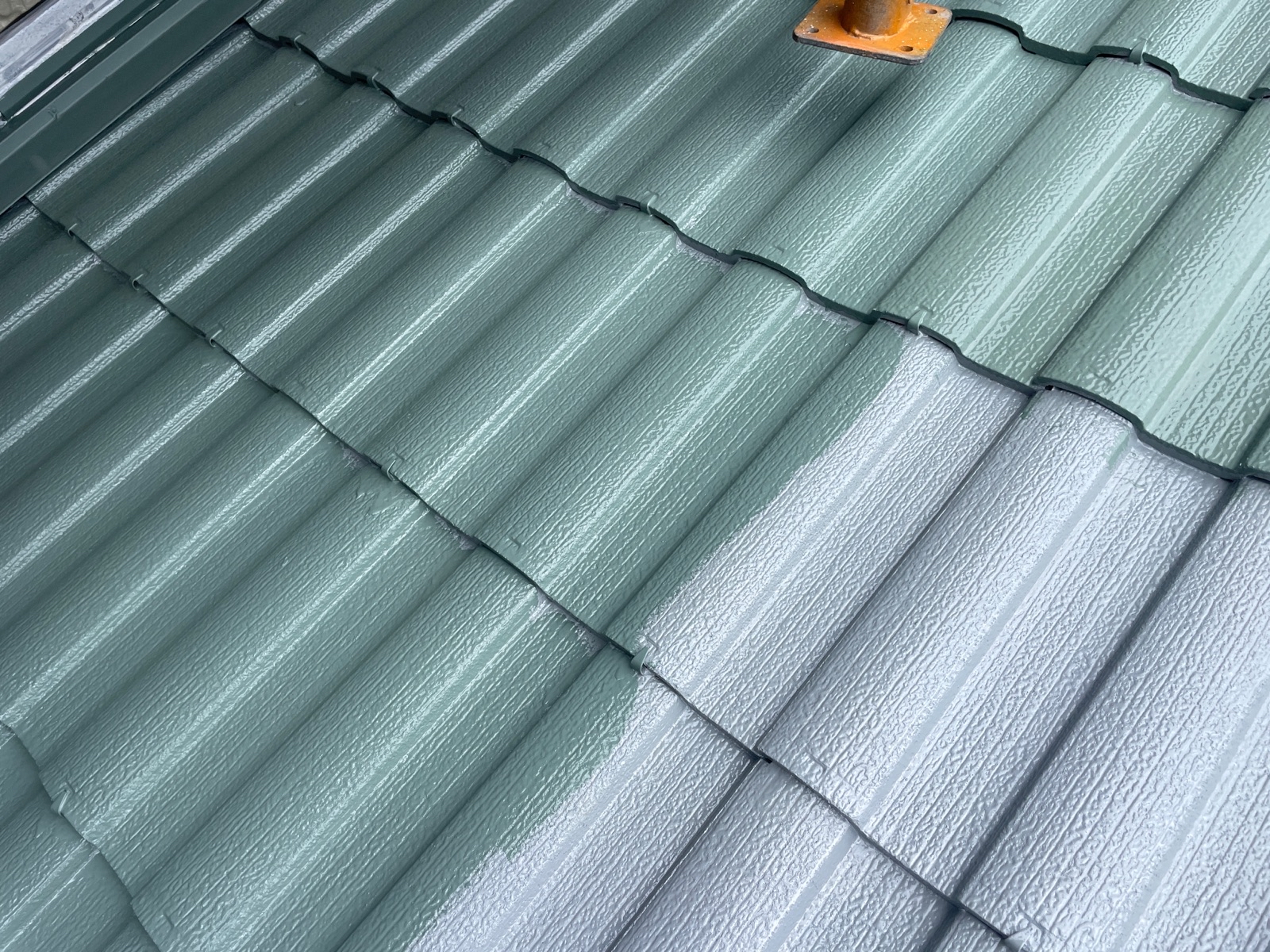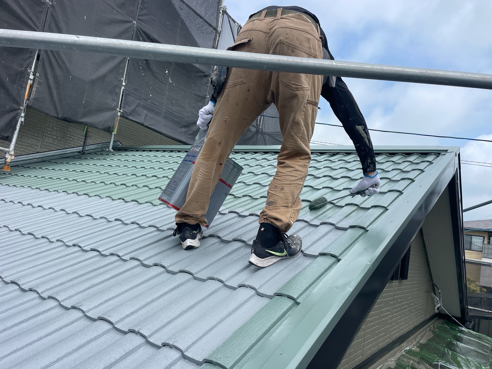 本日は、お屋根の中塗りの施工をさせて頂いております。