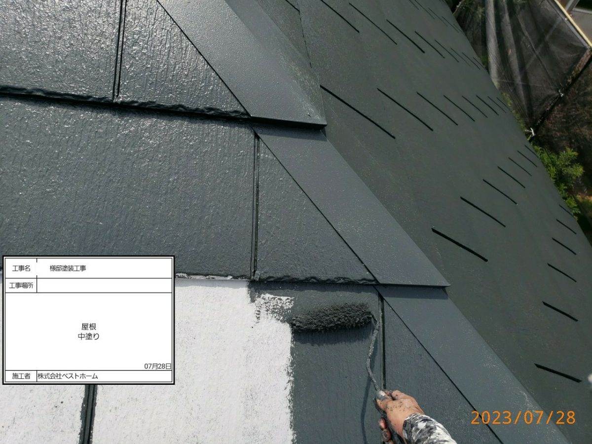 本日は、屋根上塗り1回目の施工をさせて頂いております。