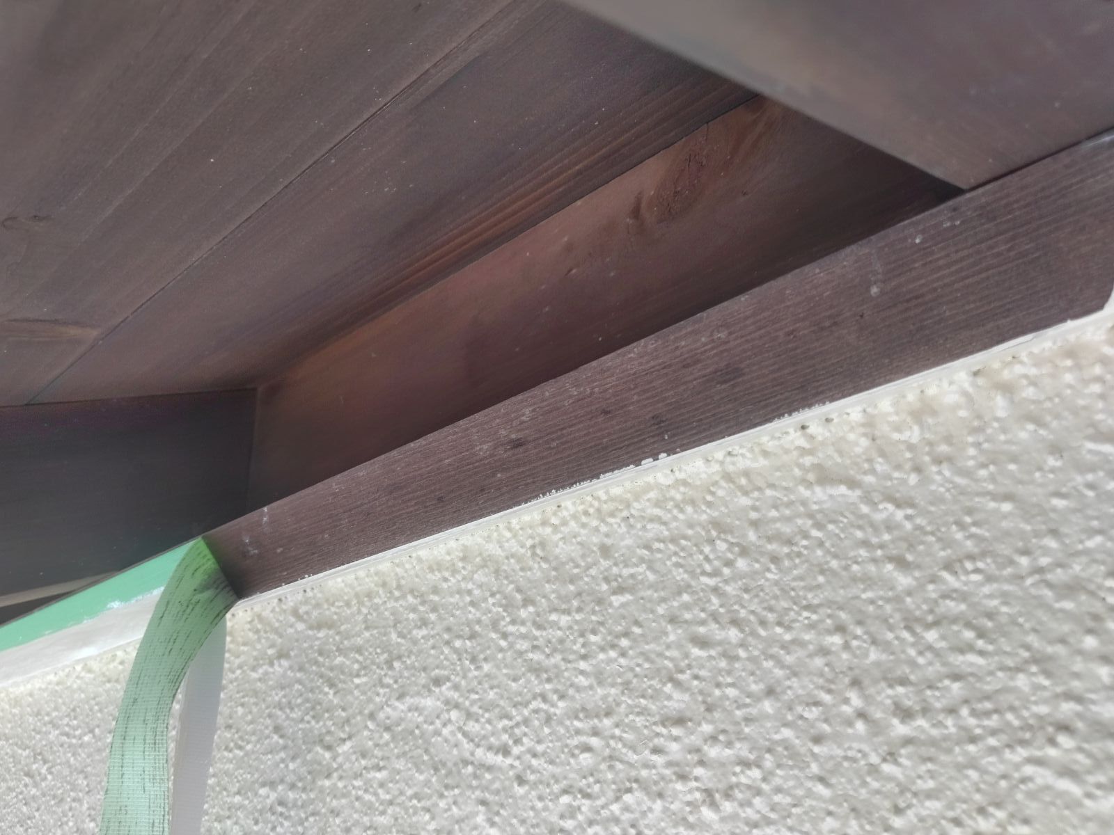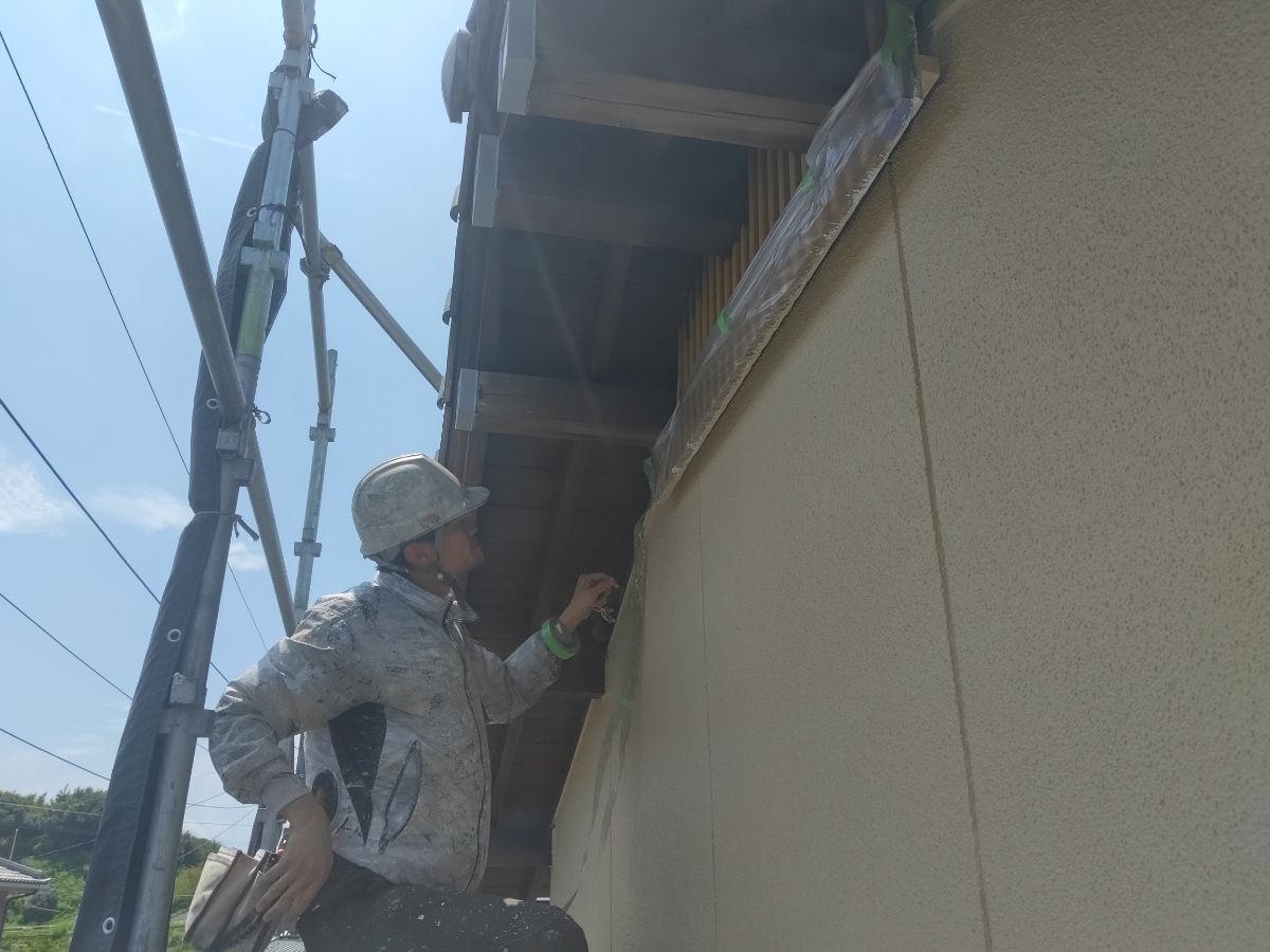 本日は外壁上塗り2回目(1階周り)、木部取り合いライン出しを行っております!