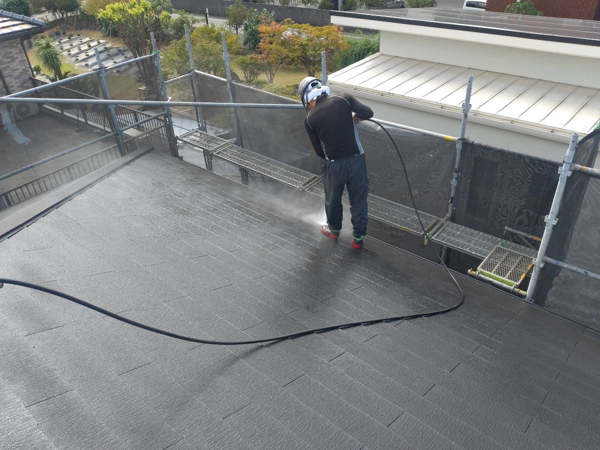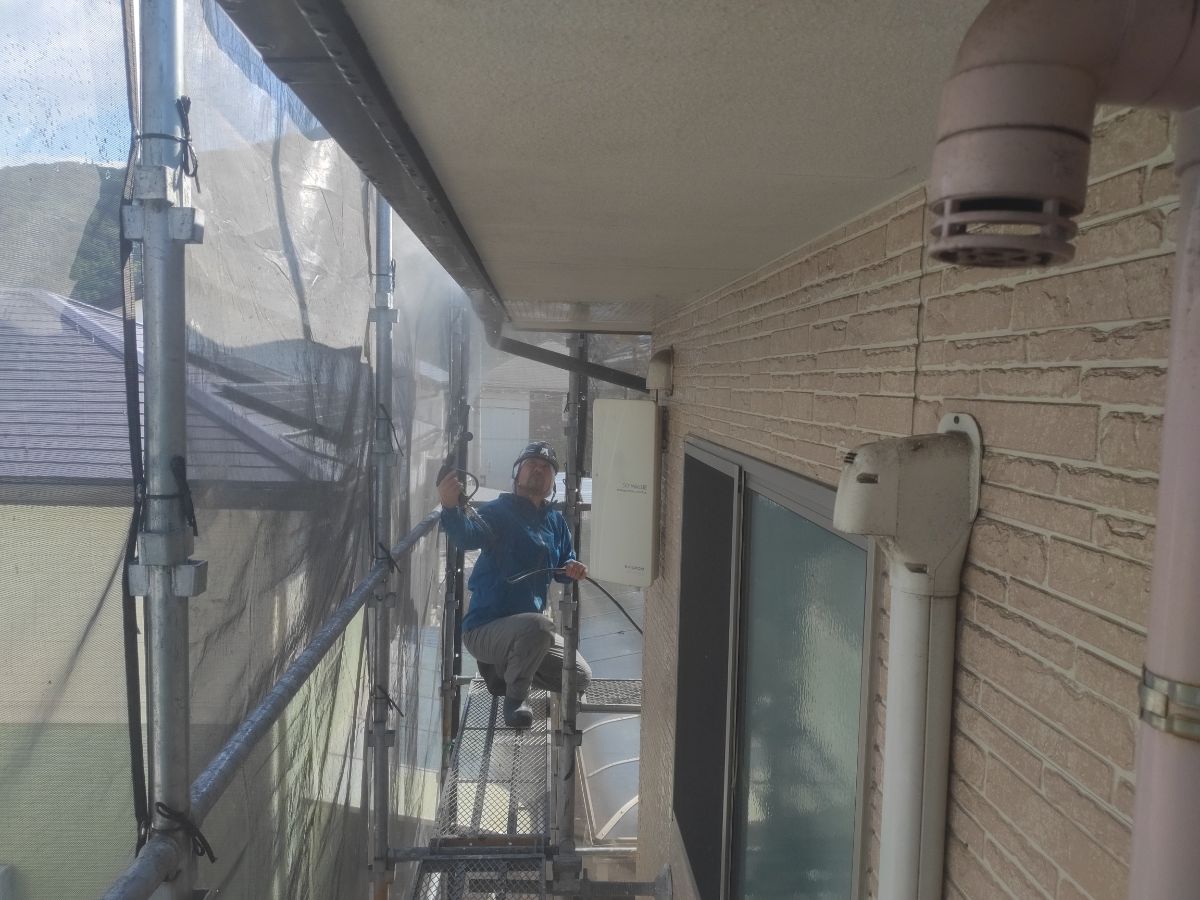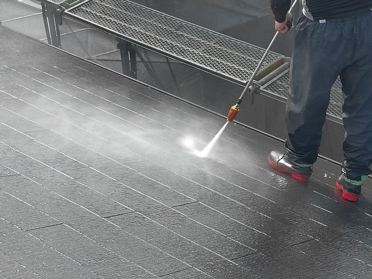 高圧洗浄では、汚れや旧塗膜をしっかりと落とし