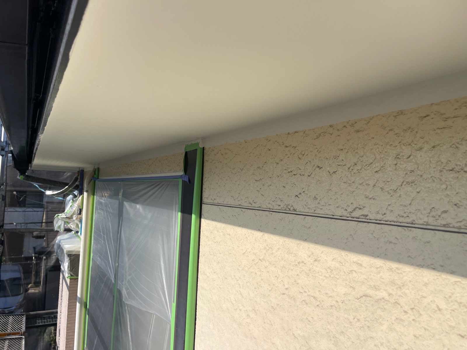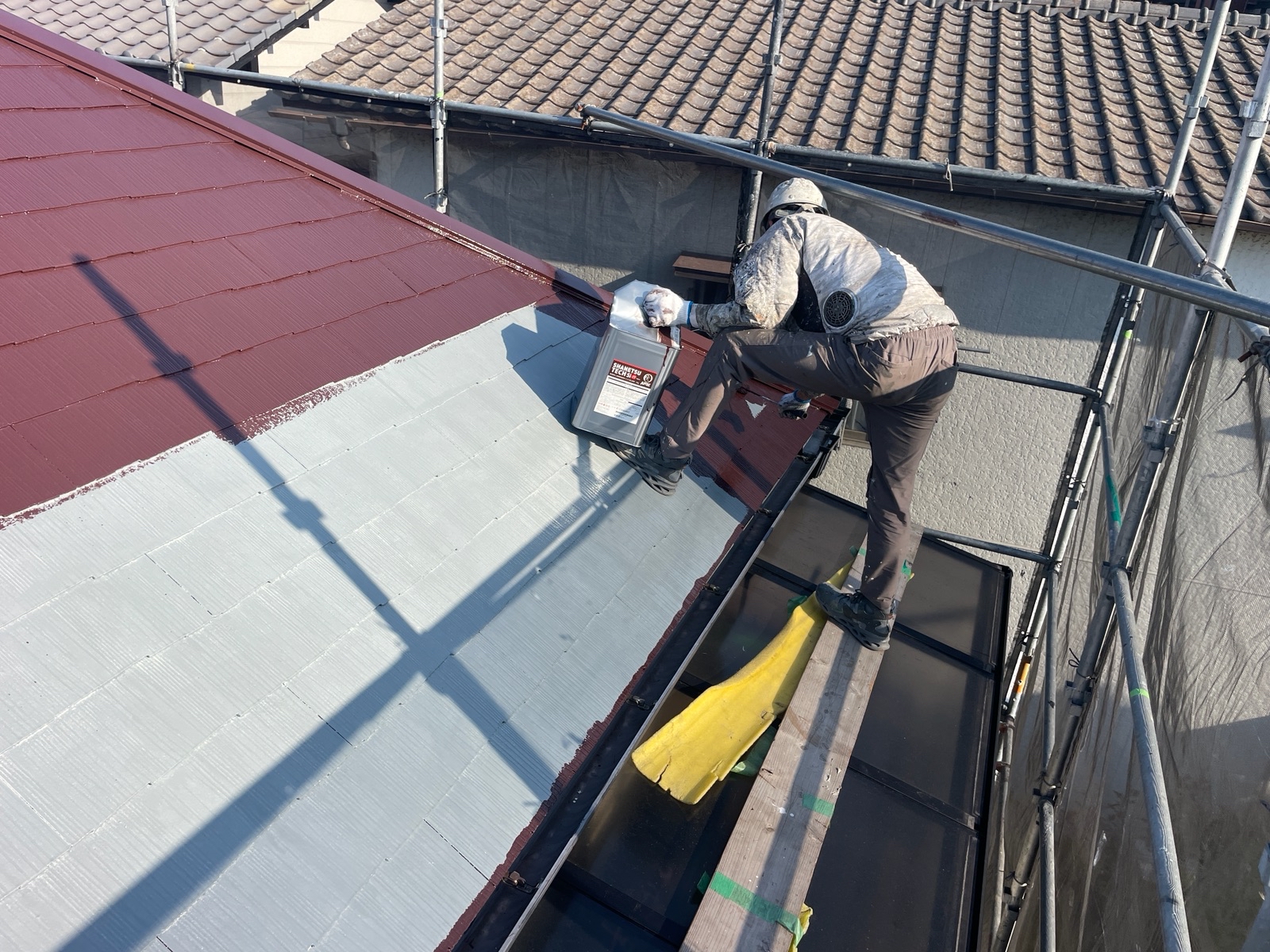 本日は、軒天塗装1回目、屋根上塗り1回目をさせて頂いております。