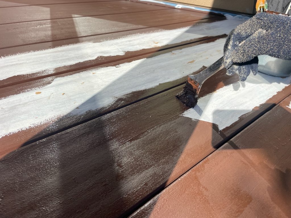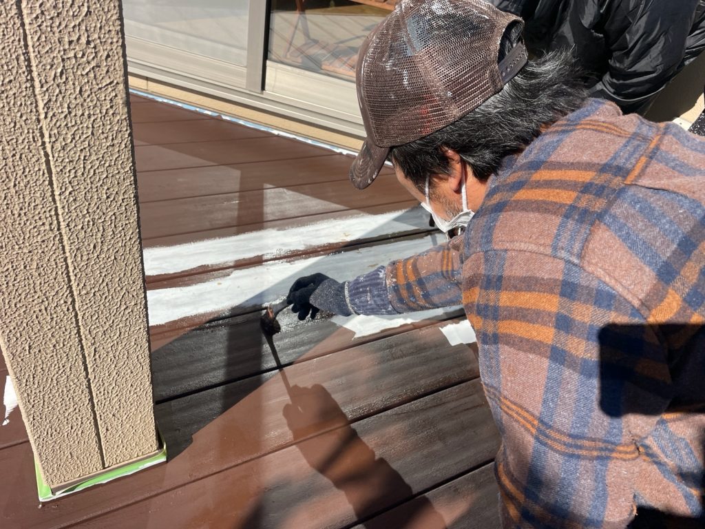 デッキには下塗りを行い、上塗りを2回かけて仕上げてまいります!