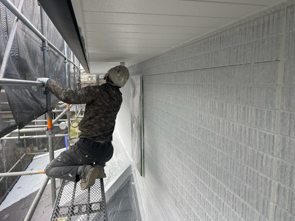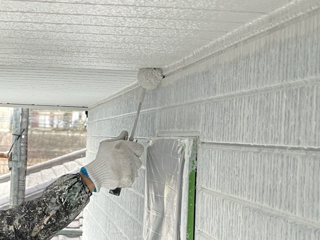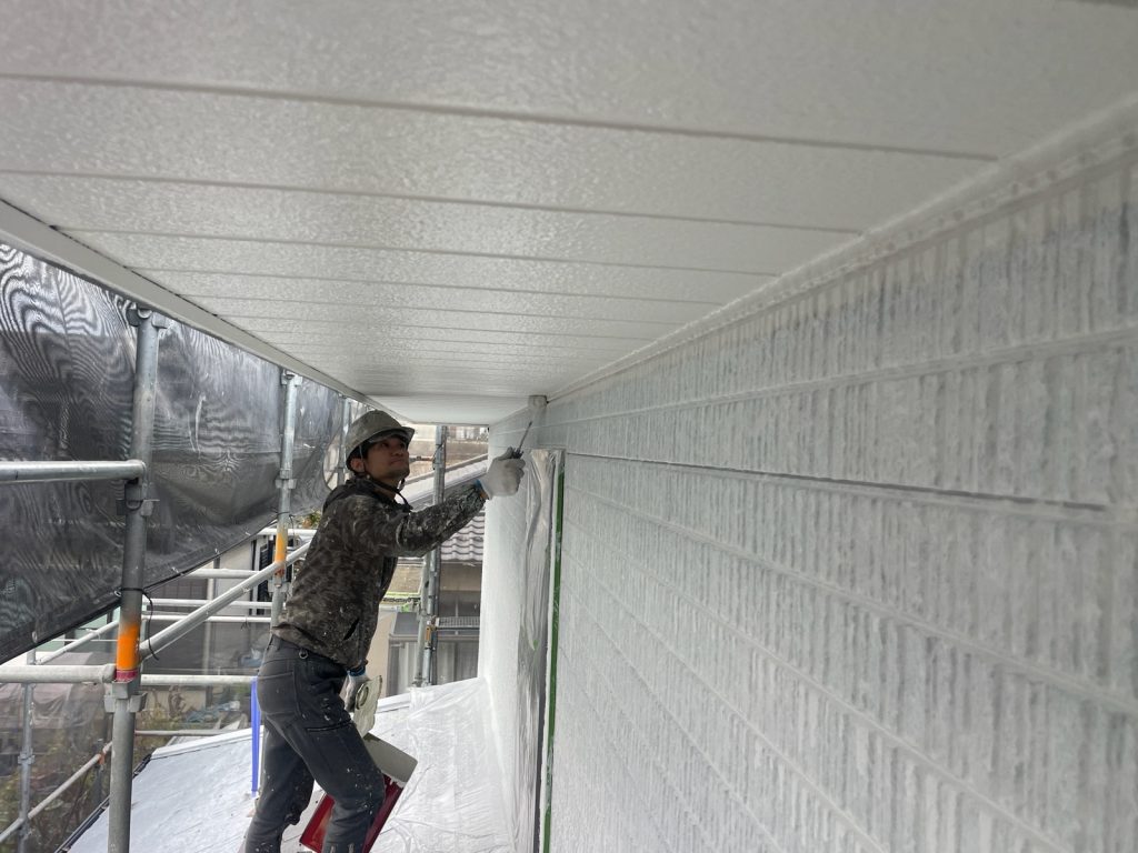 本日は、外壁下塗り2回目、屋根上塗り2回目、軒天塗装、外壁中間検査をさせて頂いております。