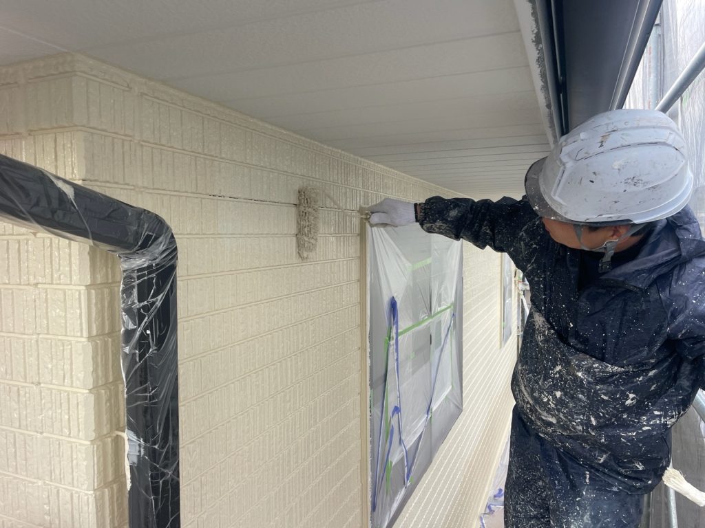 本日は、外壁上塗り2回目の施工(途中まで)をさせて頂いております。