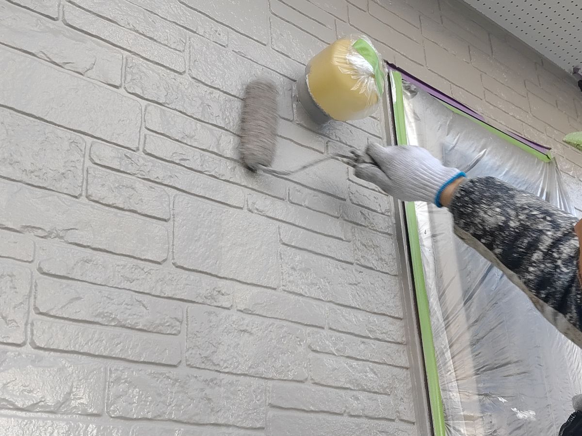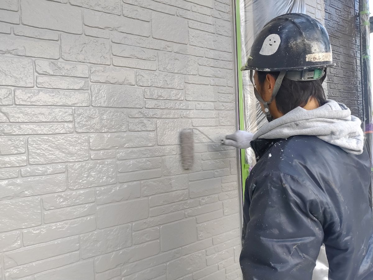 本日は、外壁上塗り2回目(アクセント以外)の施工をさせて頂いております。