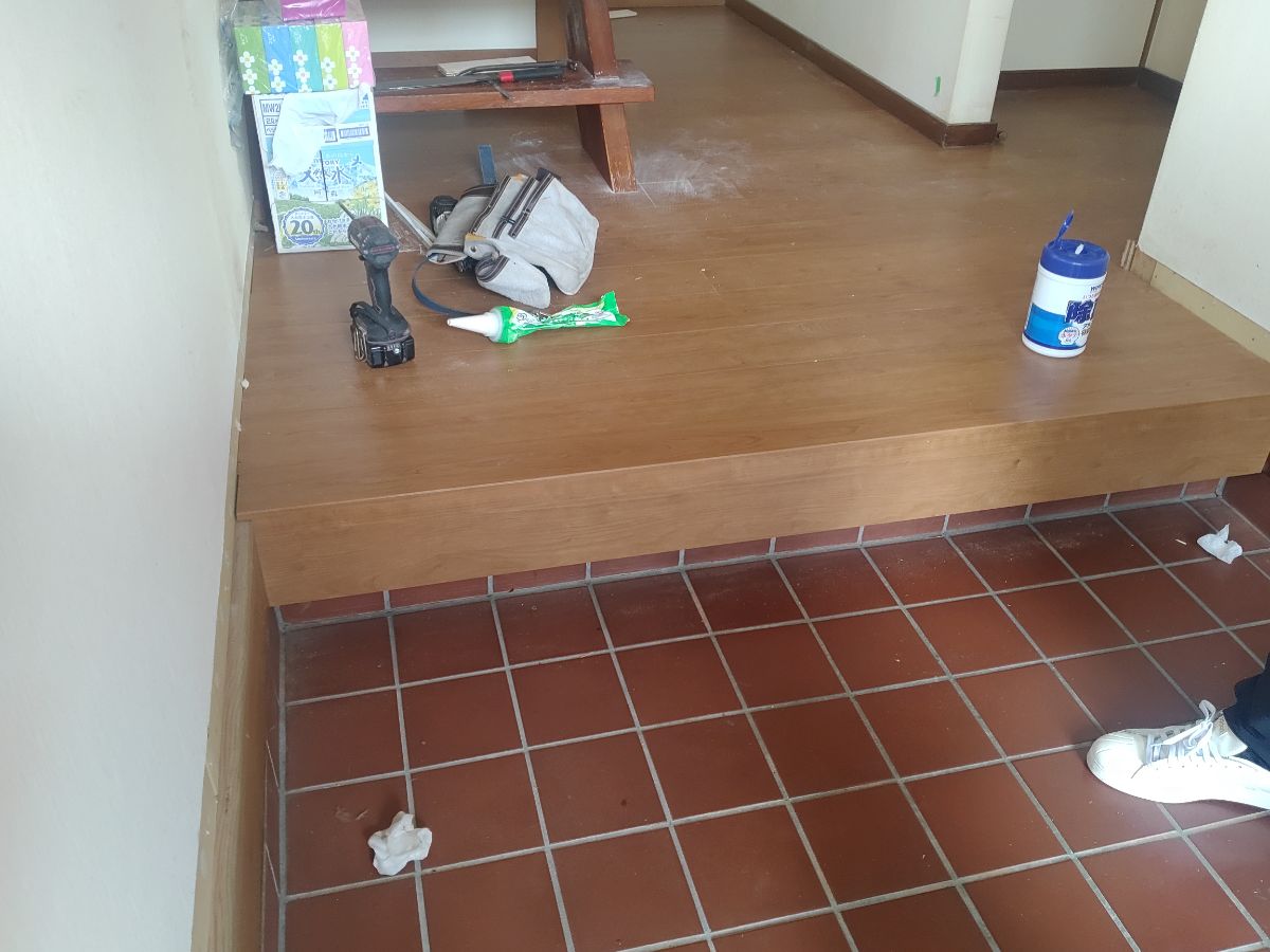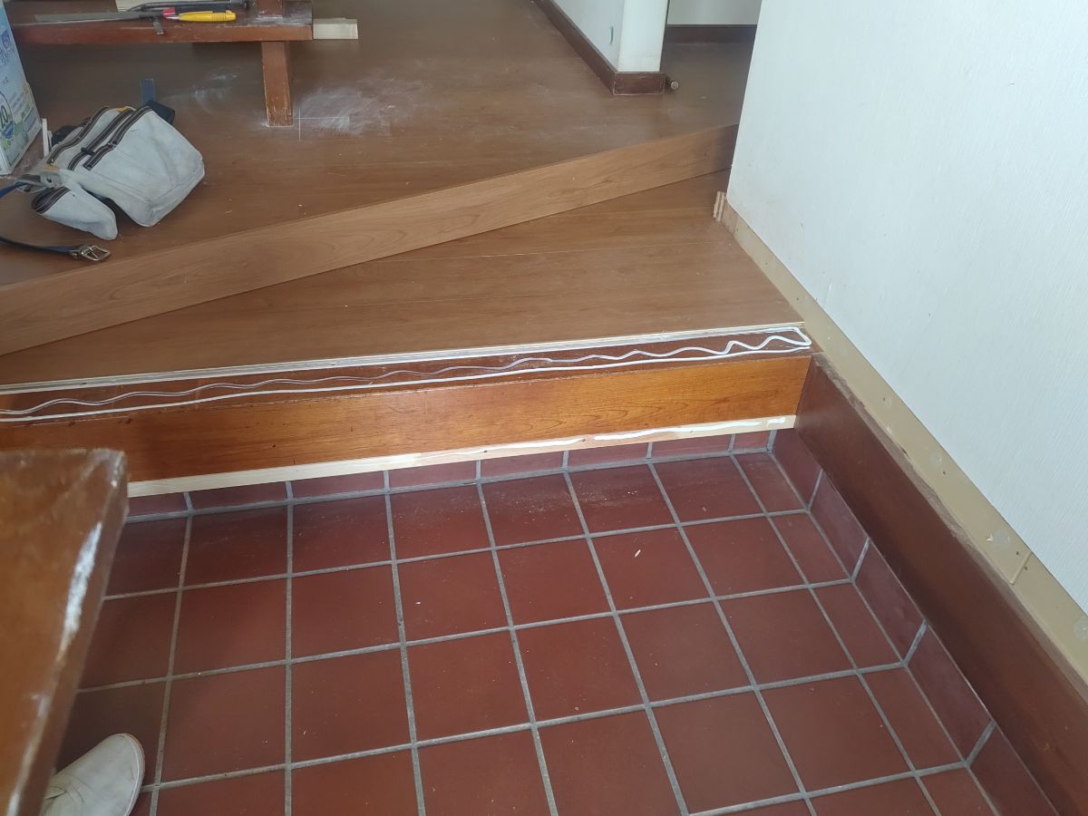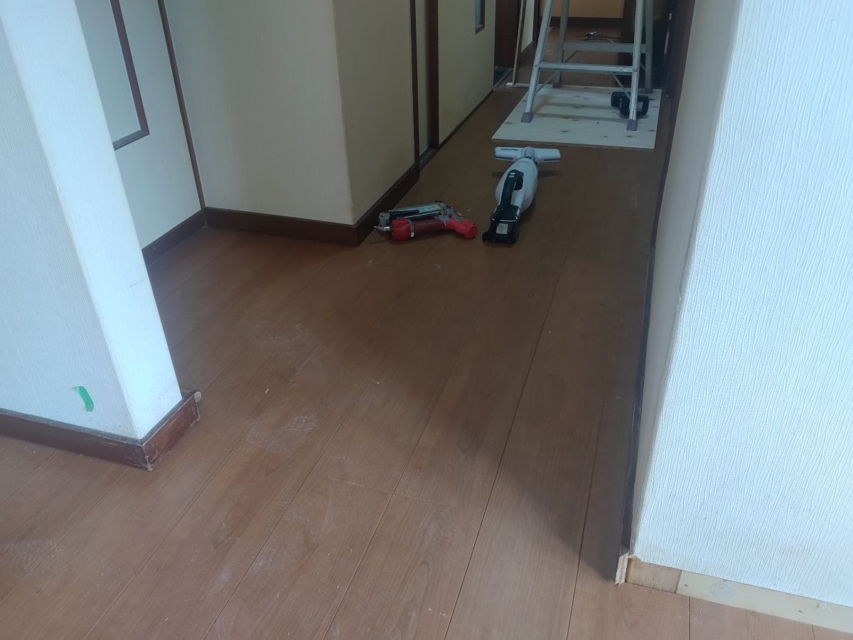 本日は、廊下・玄関フローリング張替、框取付けなどをさせて頂いております。
