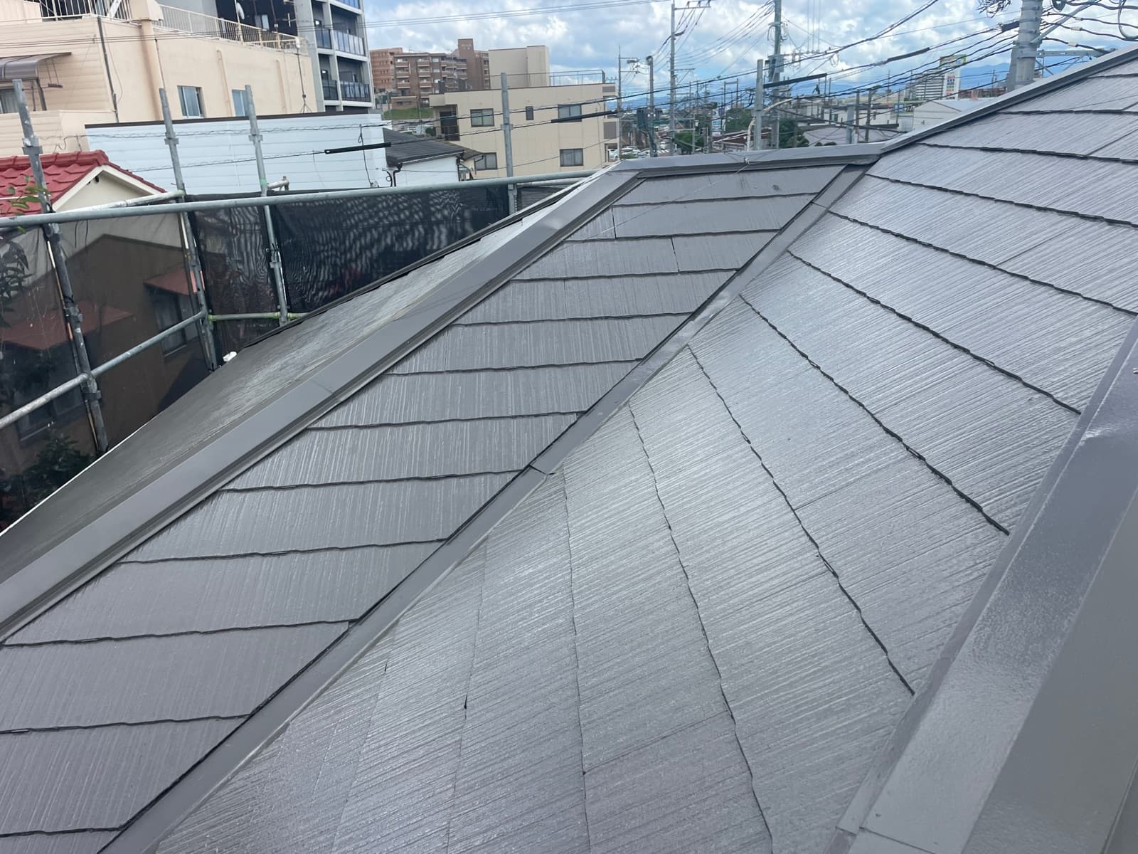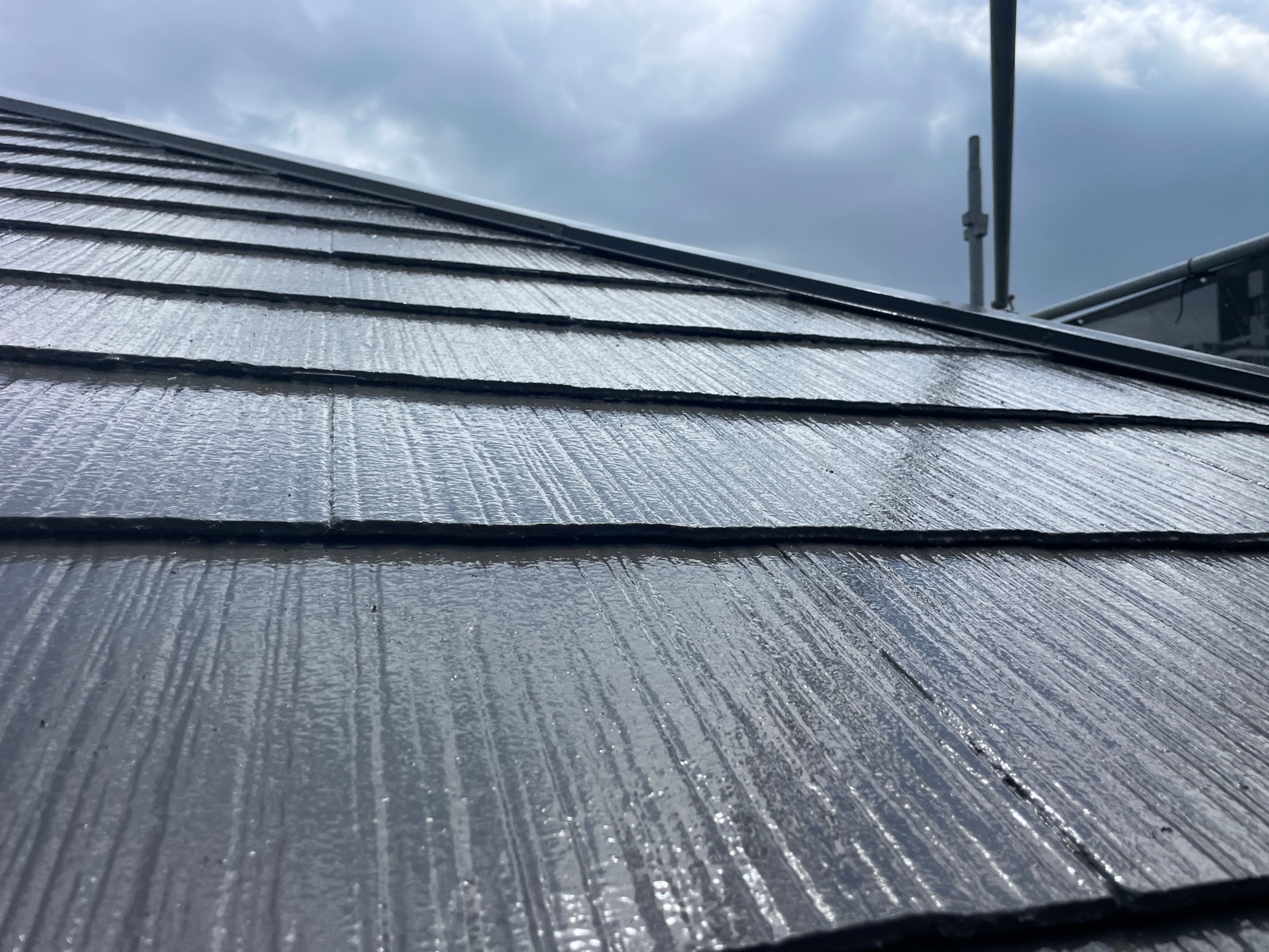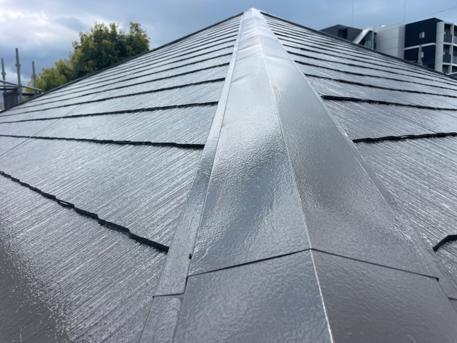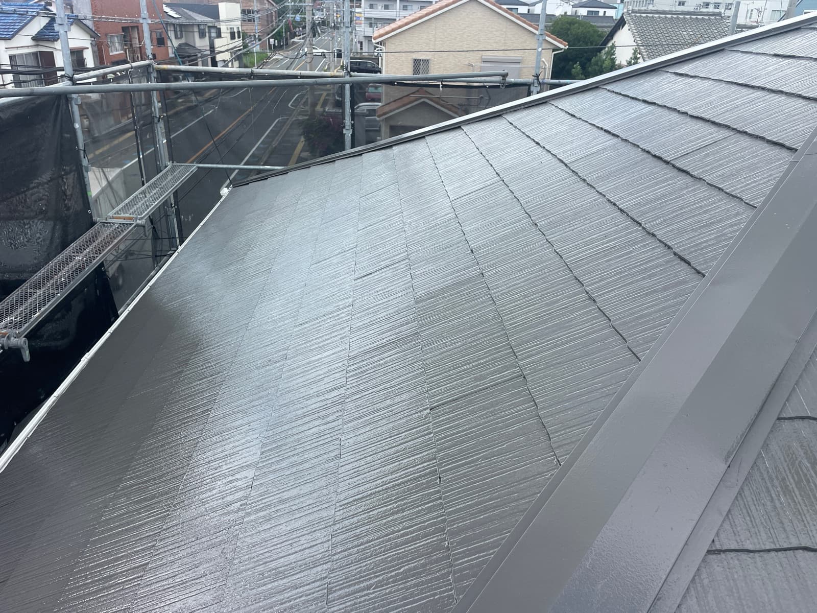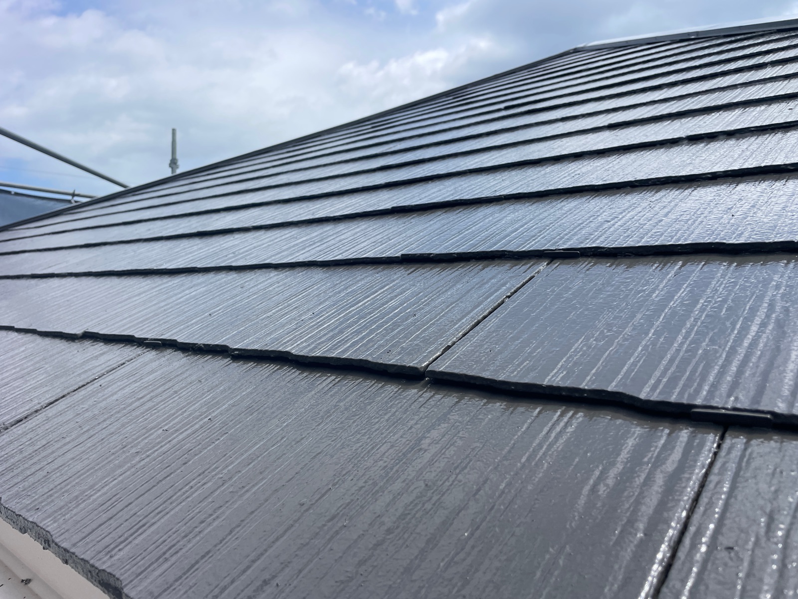 本日は屋根塗装上塗り2回目、付帯部塗装をさせて頂いております。