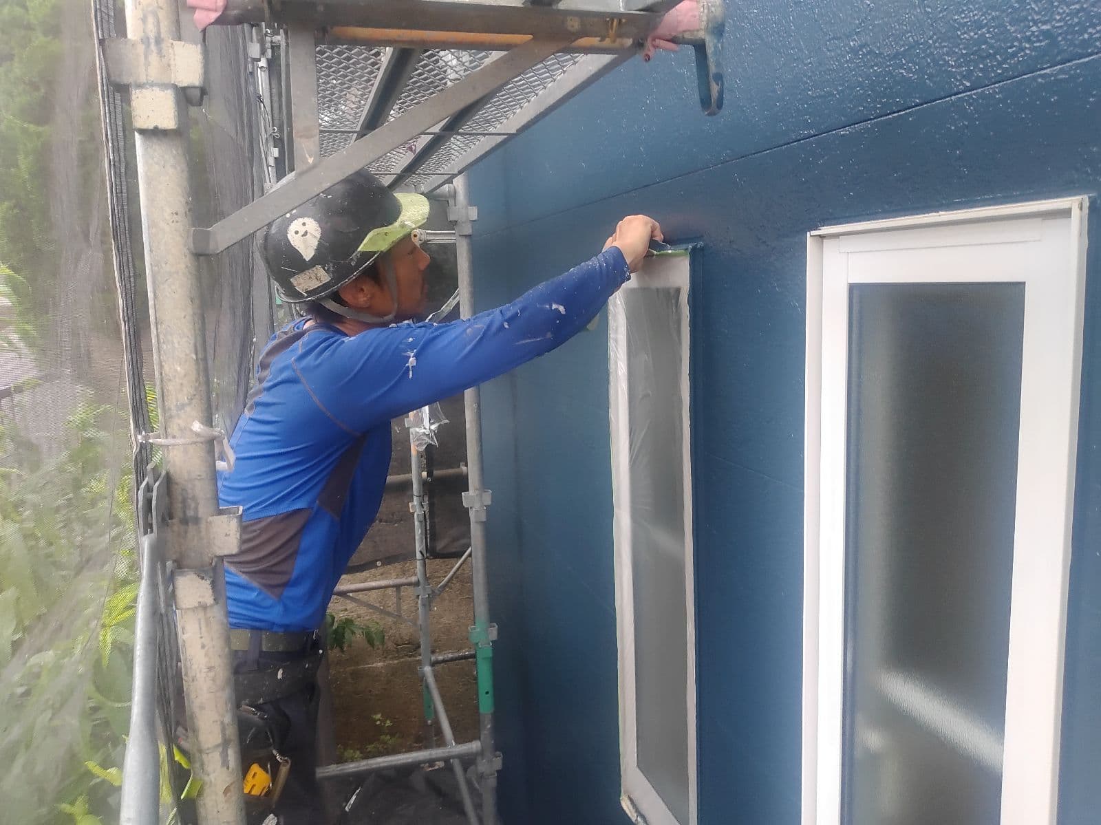 本日は外壁上塗り2回目(マウンテンブルー部)、養生バラシ、鉄部錆止めをさせて頂いております。