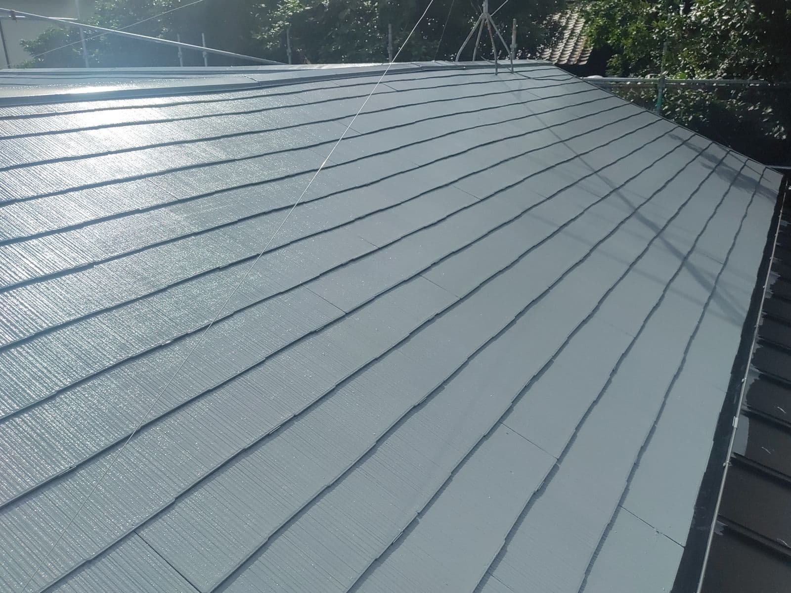 本日は屋根上塗り2回目、瓦棒屋根塗装、付帯部塗装をさせて頂いております。