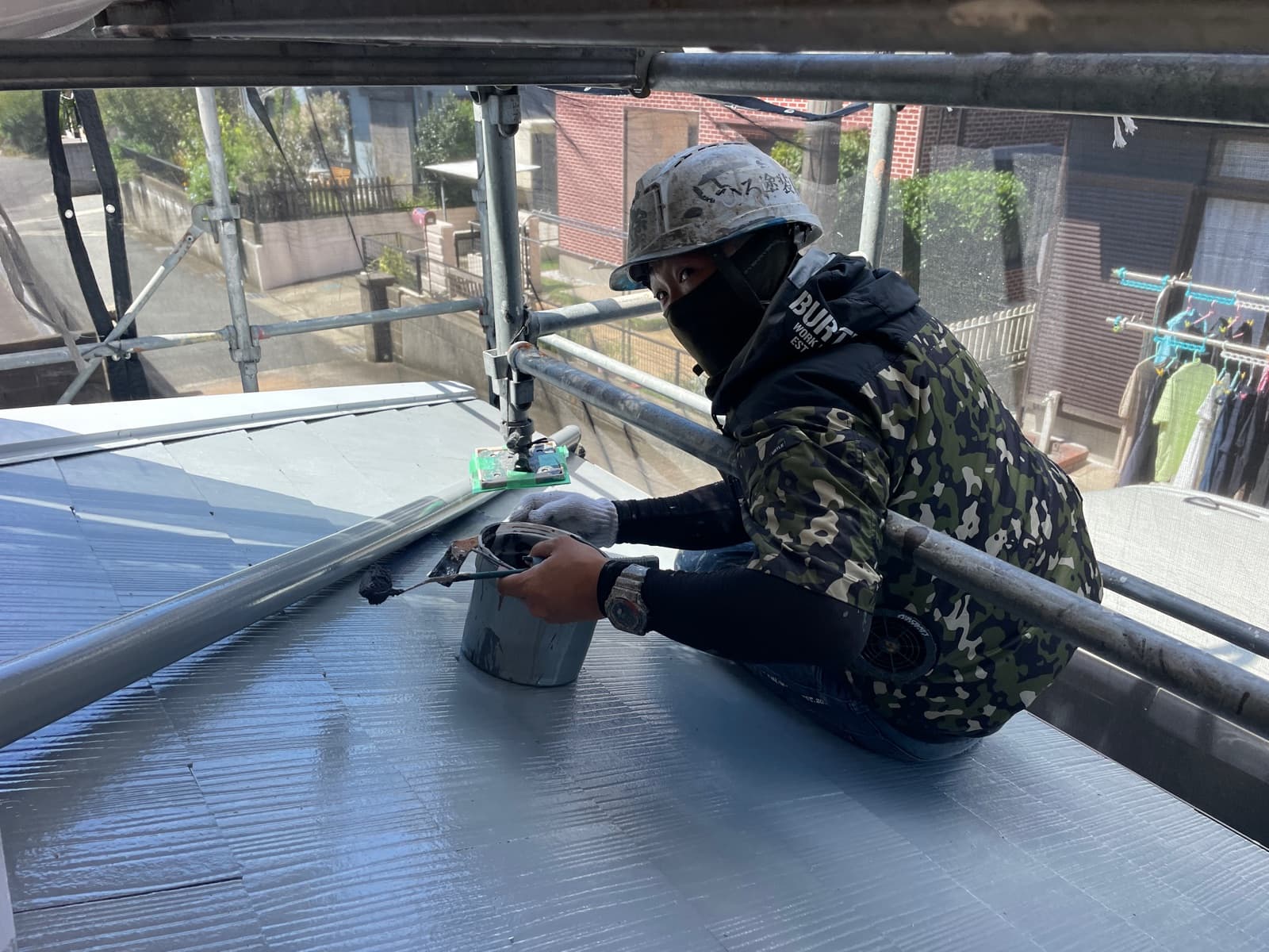 屋根の上塗り2回目を行っております!