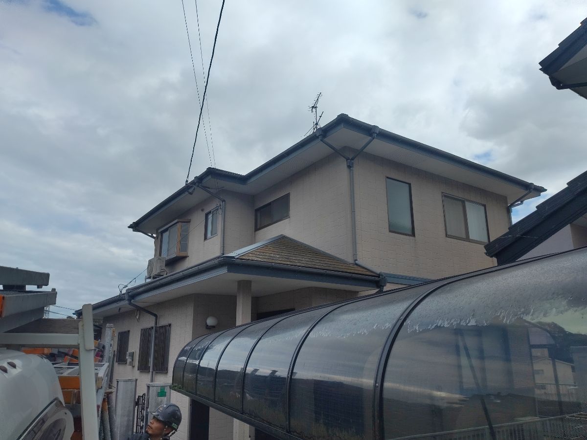 本日は、外壁の中間検査、外壁上塗り1回目、下屋根上塗り1回目をさせて頂いております。