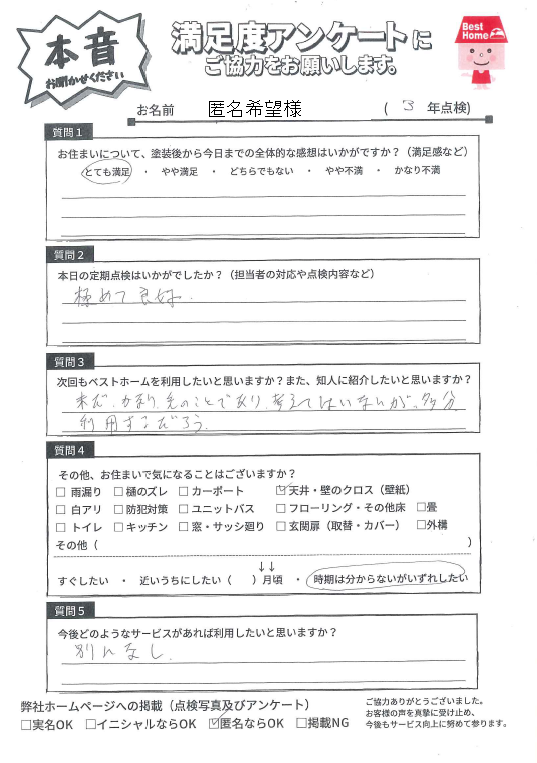 塗装を行い3年が経過しておりますが剥がれ、色褪せもなくキレイに保たれていました!コーキングの劣化もなく防水効果も持続しております!