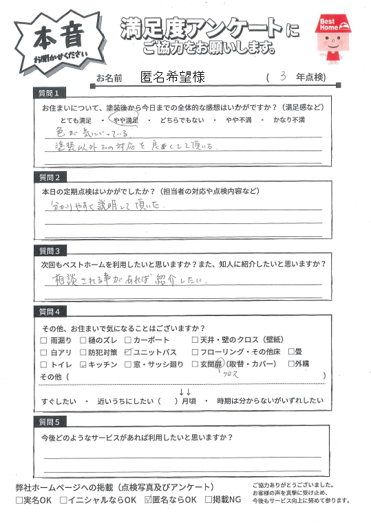 本日は八幡西区藤原にて3年点検に伺い、美観は維持できているか、劣化箇所や補修が必要な箇所はないか確認しました!点検結果、お客様からの声をぜひご参考ください。