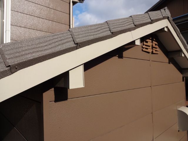 破風:屋根や外壁と比べると材質が違うため耐久年数は低いですが、塗装時のまま綺麗に保たれていました!剥がれもなく良好です!