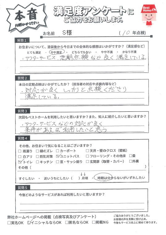 塗装を行い10年が経過しておりますが剥がれ、色褪せもなくキレイに保たれていました!コーキングの劣化もなく防水効果も持続しております!