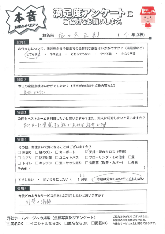 本日は田川市伊加利にて4年点検に伺い、美観は維持できているか、劣化箇所や補修が必要な箇所はないか確認しました!点検結果、お客様からの声をぜひご参考ください。