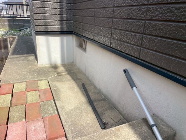 水切り:塗装時のままきれいに保たれていました!水切りを塗装することによって、雨水や土台の腐食、シロアリの発生を防ぐことができます。お住まいの大切な土台を塗装で守っています!