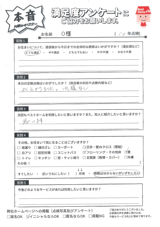 本日は行橋市南泉にて10年点検に伺い、美観は維持できているか、劣化箇所や補修が必要な箇所はないか確認しました!点検結果、お客様からの声をぜひご参考ください。