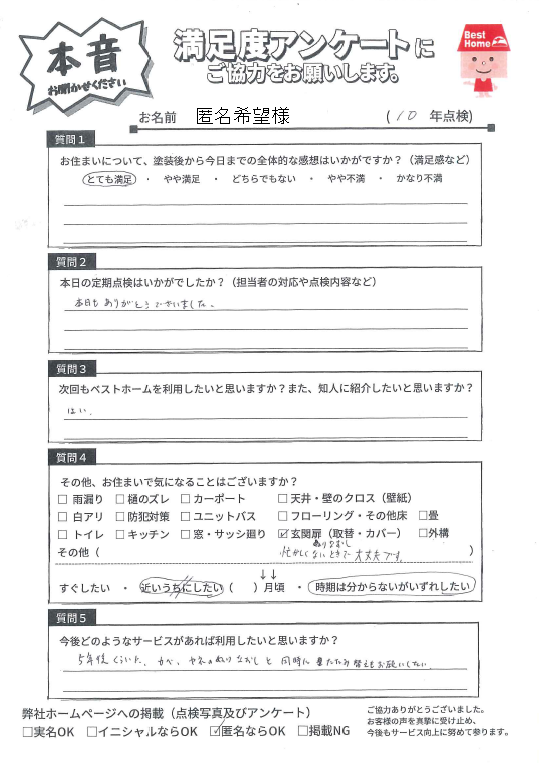 本日はみやま市高田町濃施にて10年点検に伺い、美観は維持できているか、劣化箇所や補修が必要な箇所はないか確認しました!点検結果、お客様からの声をぜひご参考ください。