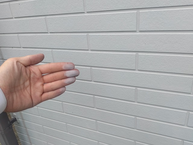 塗装から12年経過しましたので、日当たりの良い外壁面はチョーキング現象が著しく、防水効果が低下しております。