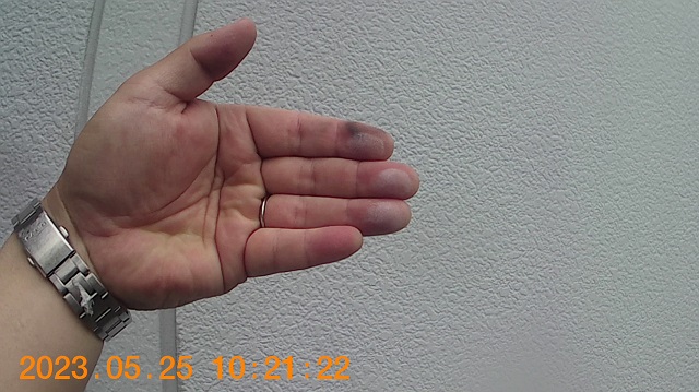 塗装から9年経過しましたので、チョーキング現象が見受けられ、外壁の防水効果が低下しております。北西の面にヒビを数か所確認しました。