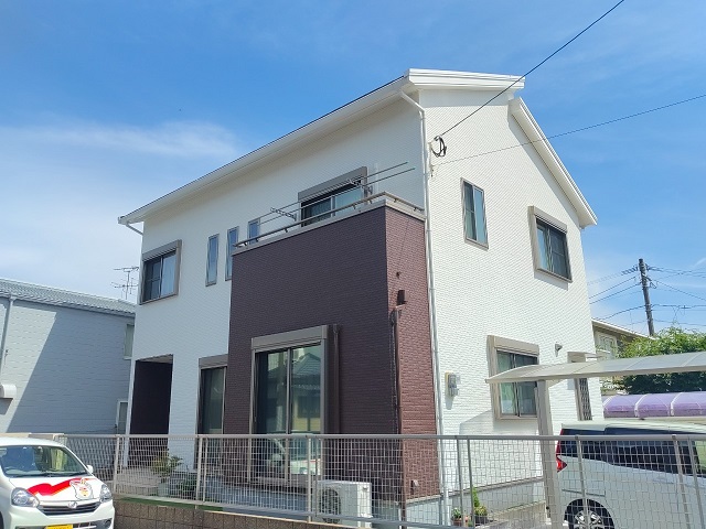 塗装を行い1年が経過しておりますが剥がれ、色褪せもなくキレイに保たれていました!コーキングの劣化もなく防水効果も持続しております!