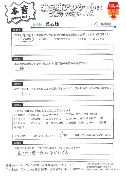 本日は遠賀郡遠賀町田園にて6年点検に伺い、美観は維持できているか、劣化箇所や補修が必要な箇所はないか確認しました!点検結果、お客様からの声をぜひご参考ください。