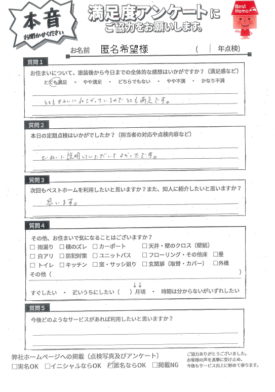 本日は小倉南区長行西にて1年点検に伺い、美観は維持できているか、劣化箇所や補修が必要な箇所はないか確認しました!点検結果、お客様からの声をぜひご参考ください。