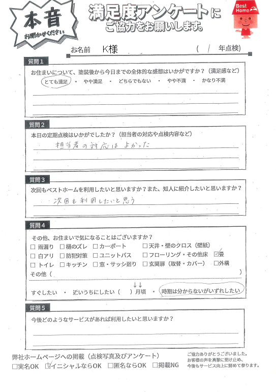 本日は小倉南区若園にて1年点検に伺い、美観は維持できているか、劣化箇所や補修が必要な箇所はないか確認しました!点検結果、お客様からの声をぜひご参考ください。