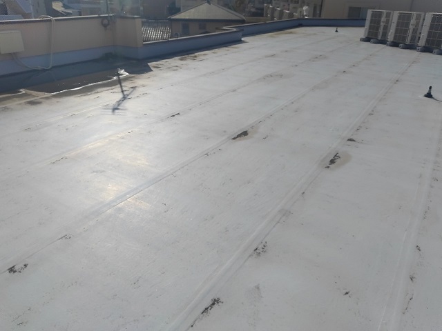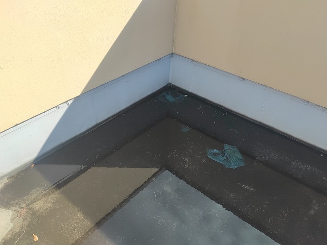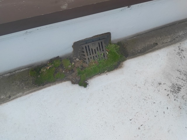 一部塗膜下のシートが破れております。排水溝周りに砂埃やコケがあり、排水の邪魔をしております。清掃をおすすめいたします。